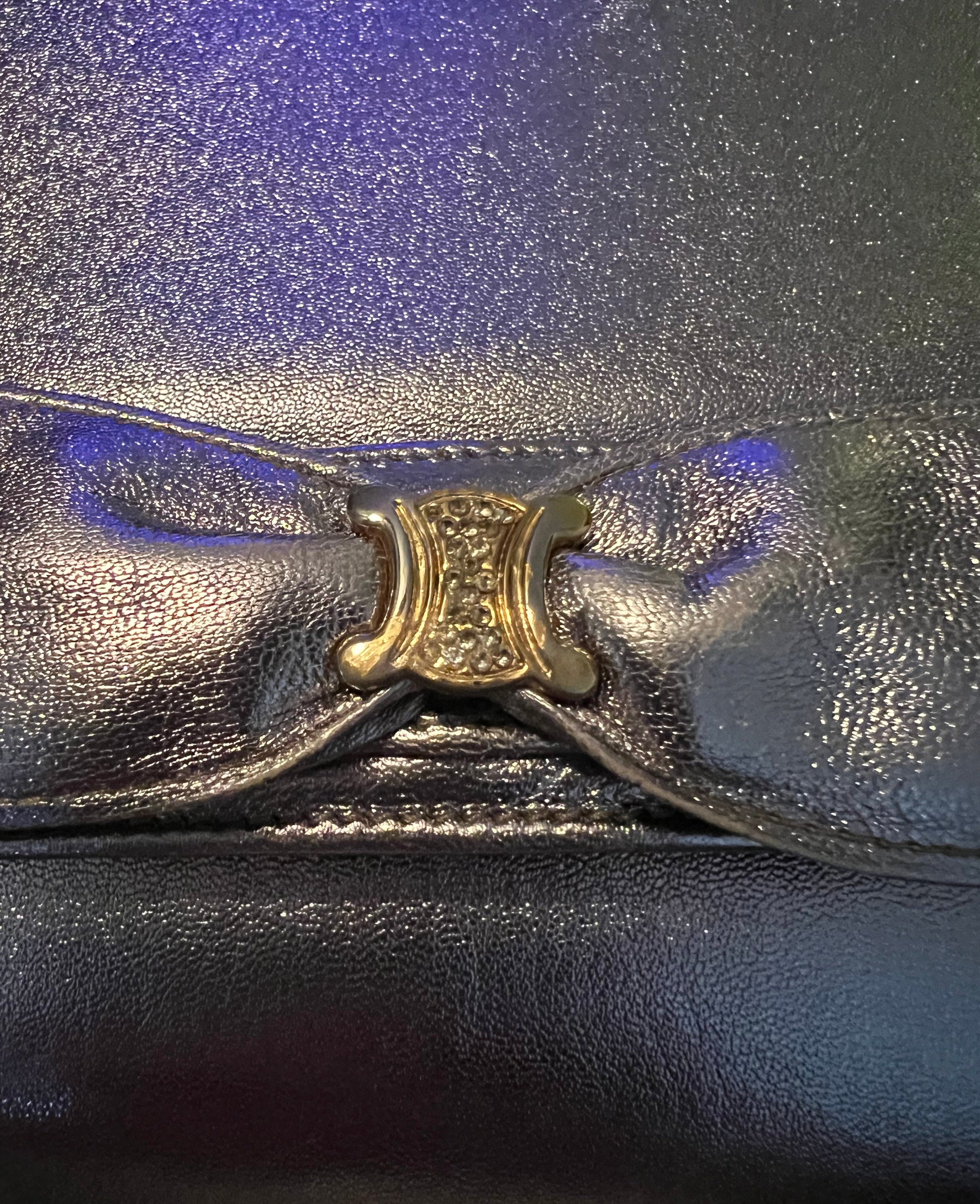 This clutch is in very good condition. The hardware has some silvering, and the front triomphe logo is missing a small crystal, which is barely noticeable. The leather has some normal wrinkling and scuffs.
