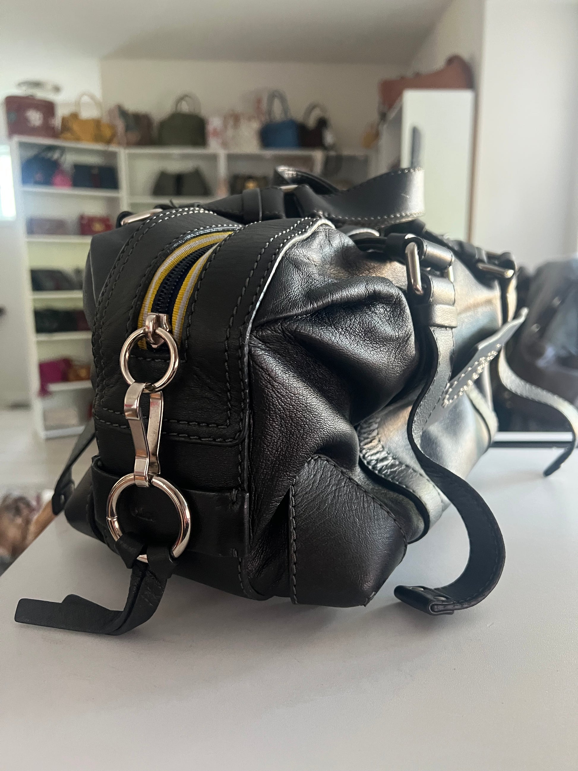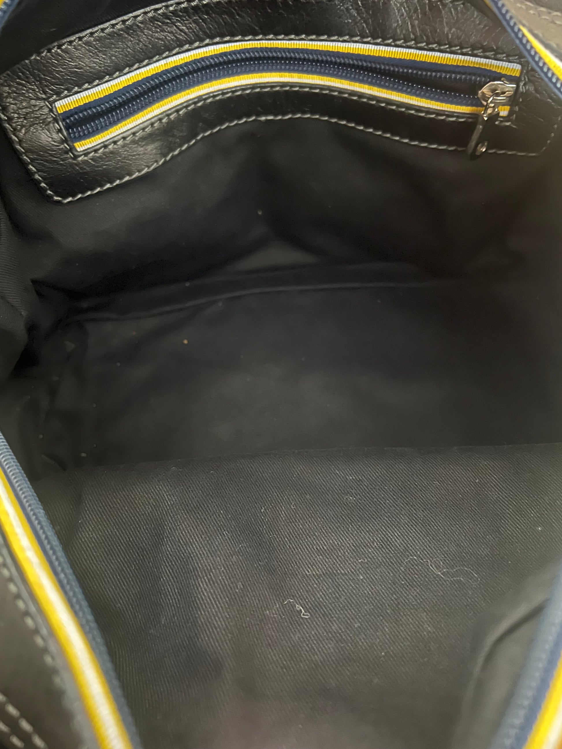 Beautiful bag made of soft black lambskin with the silver studded logo. It has navy and yellow small canvas stripes around the zipper. Blue contrast stitching.