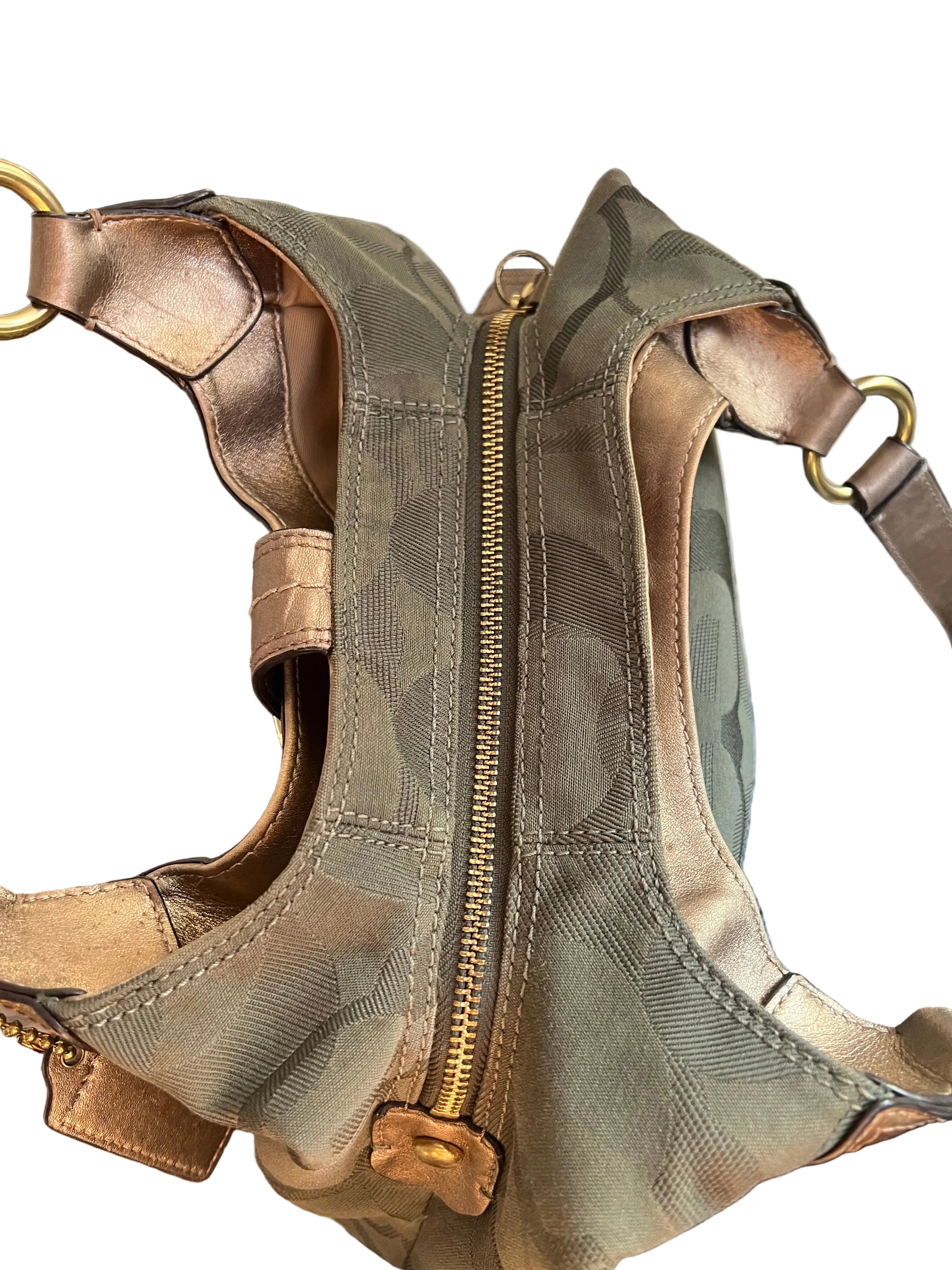 Dark green canvas and tan leather. This bag is in very good condition. There is a slight relaxation in shape and normal wrinkling in the leather. There is a minor spot or too on the leather and slight darkening to hardware in places. Straps have normal feeling of use.