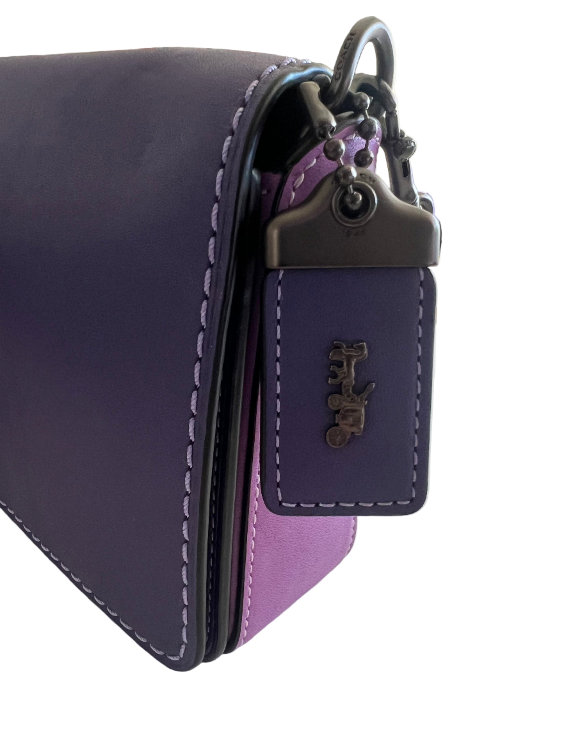 Glovetanned leather in contrasting colors of purple. Gunmetal hardware with a caramel-colored leather within the chain. Inside is all leather with a kiss lock coin pouch. Beautiful hang tag is attached.