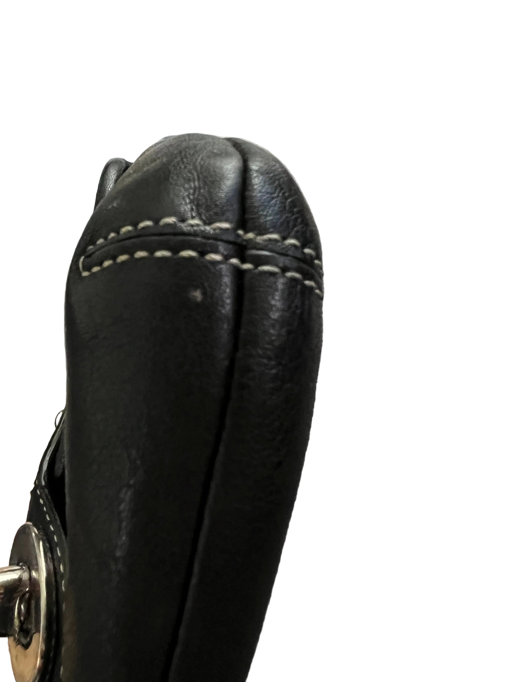 Shape has relaxed, normal wrinkling in leather, slight dullness to hardware.