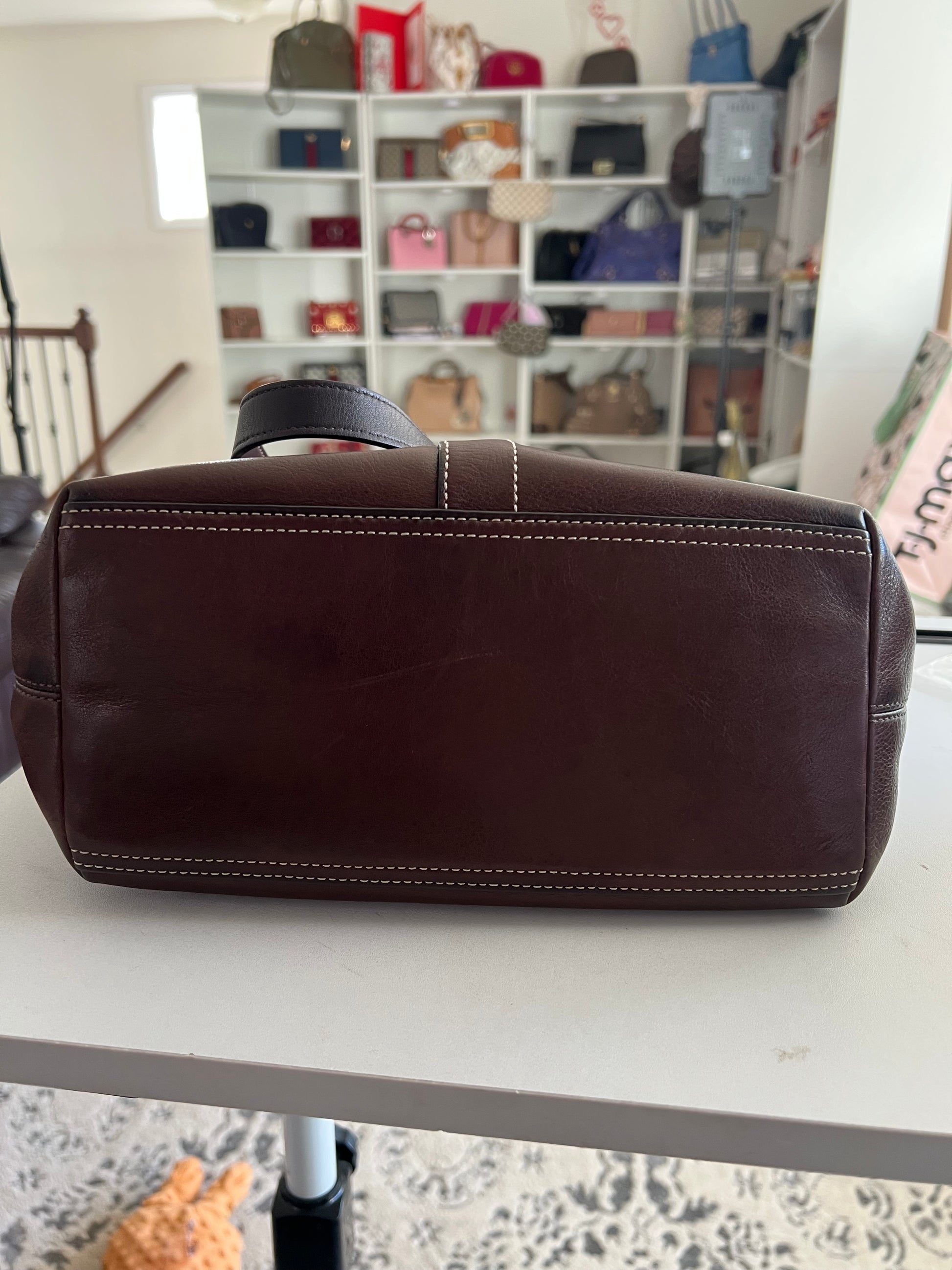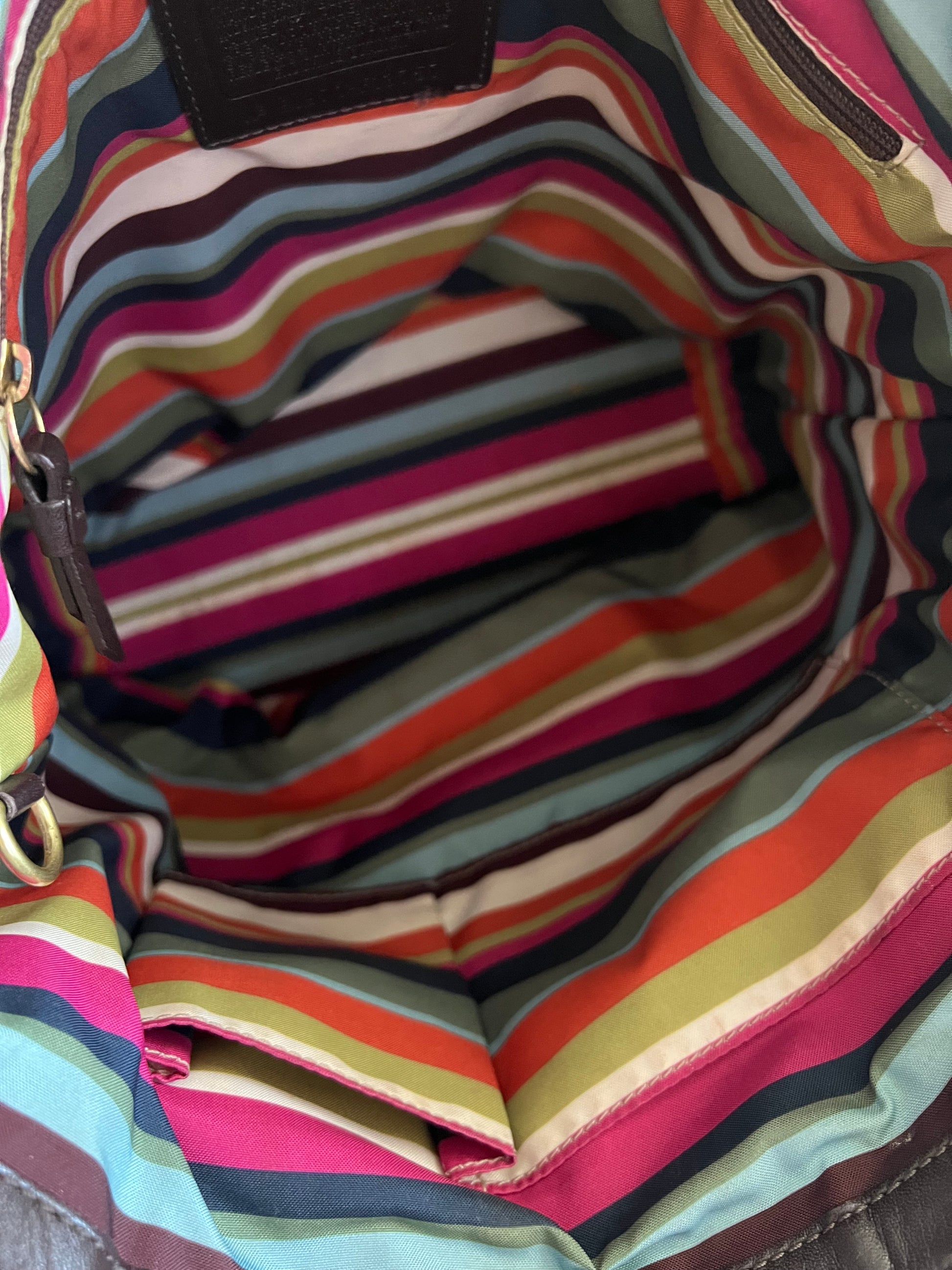 Dark Brown leather with gold-toned hardware. Inside has legacy stripe fabric.