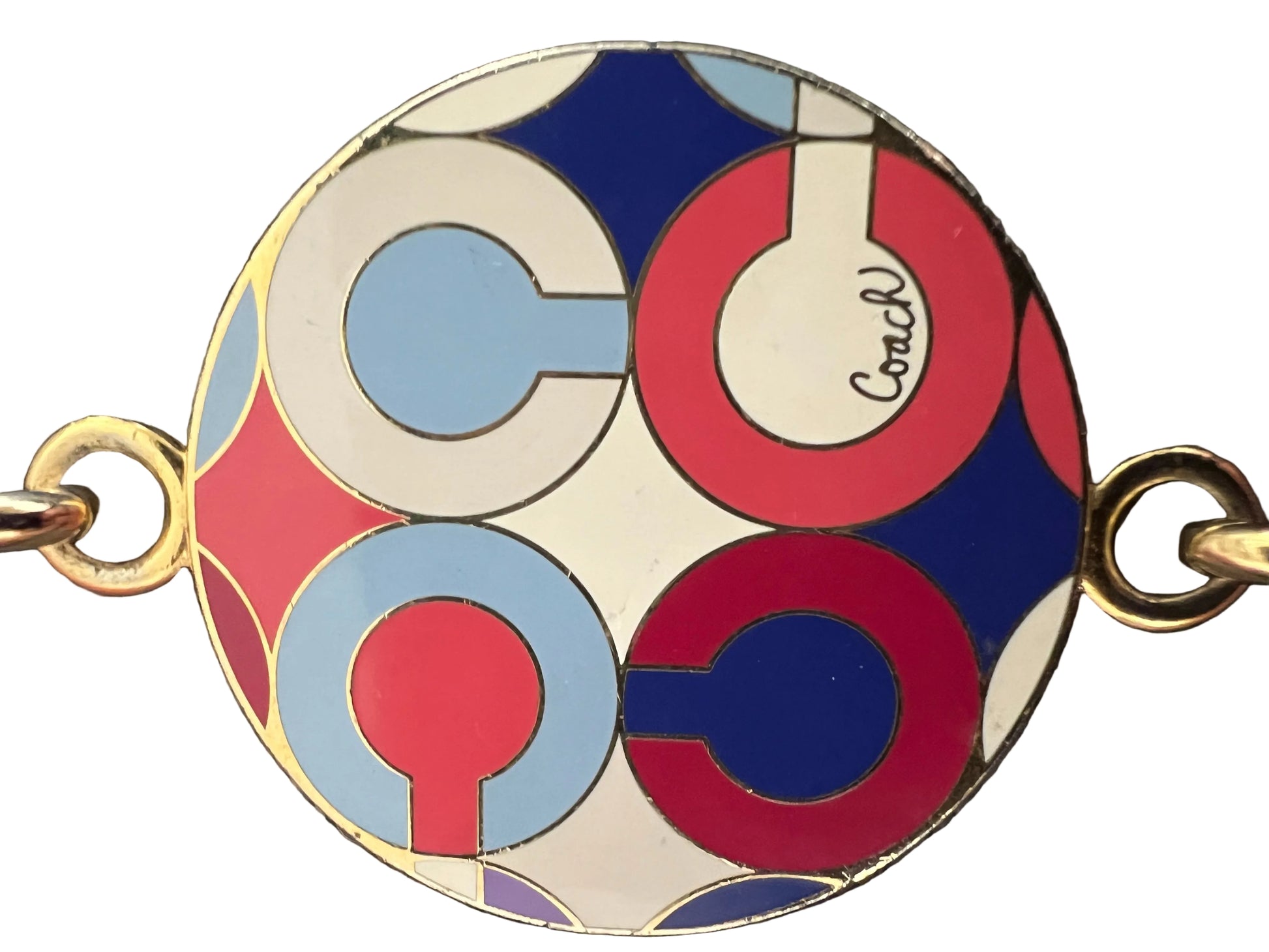 This is a vintage Coach chain with colored Coach charms. It is in very good condition with some hairline scratches on the hardware and some very minor discoloration.