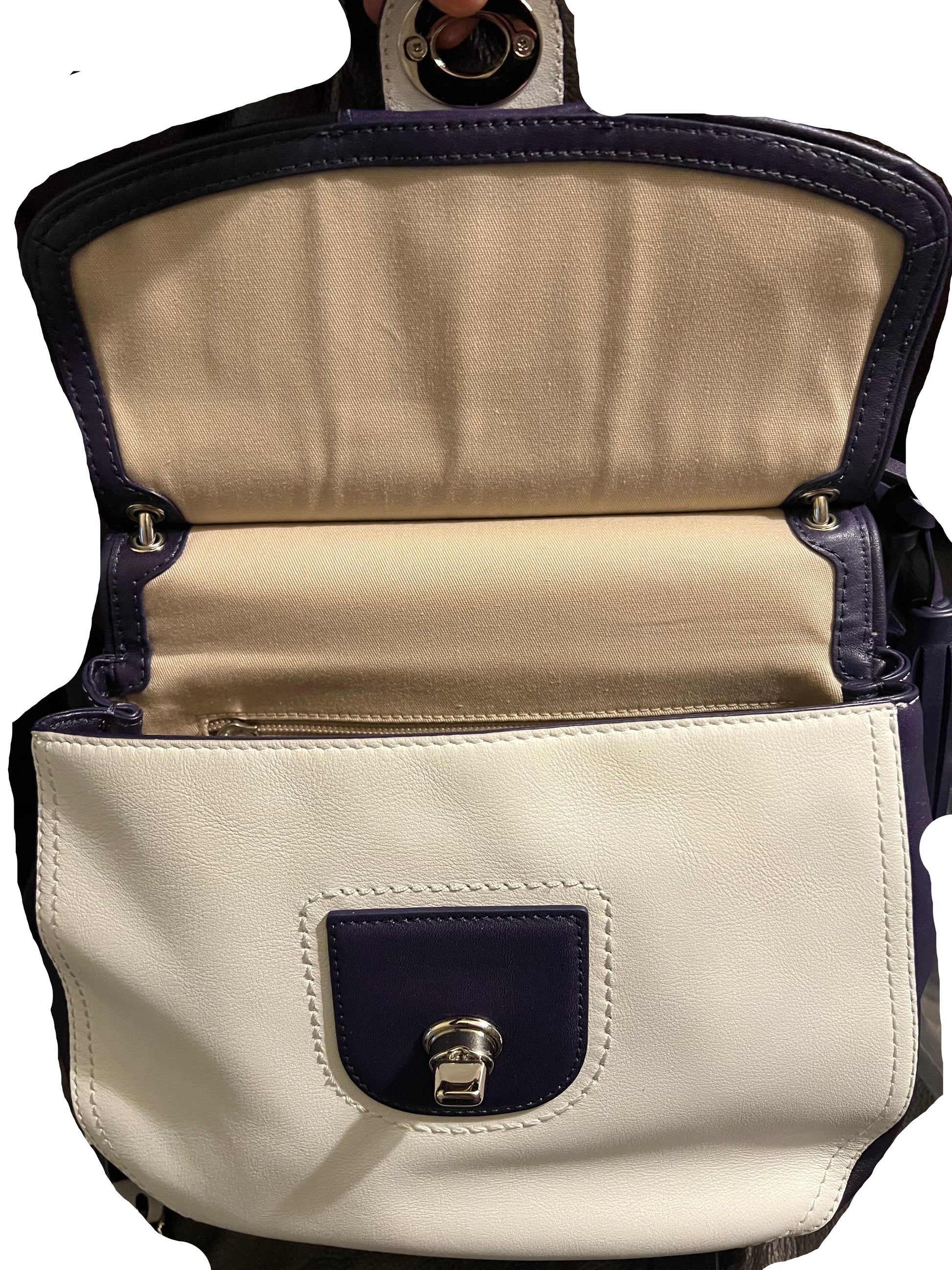 This bag is in excellent condition. The shape has relaxed due to normal use and there is some wrinkling to the leather. Comes with an adjustable crossbody strap that is also two-toned.