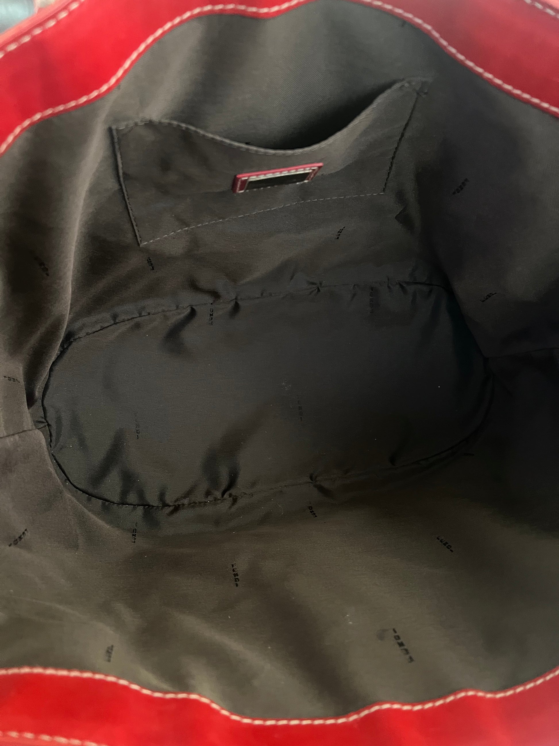 This tote is in very good condition. The shape has relaxed due to wear. There is normal wrinkling in the leather. There are some light spots and indentations on the leather trim and slight discoloring on parts of the hardware. Corners have very light wear.