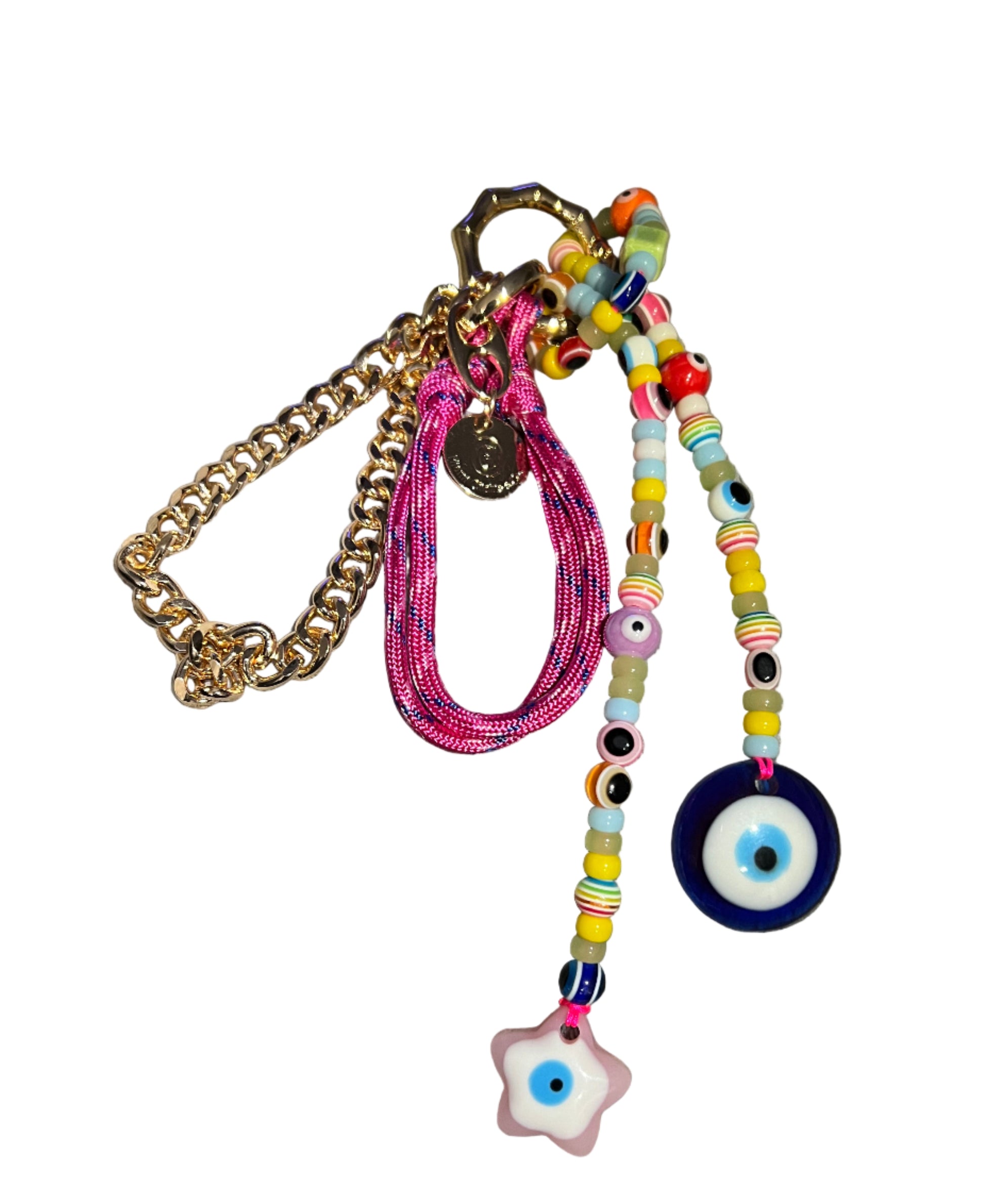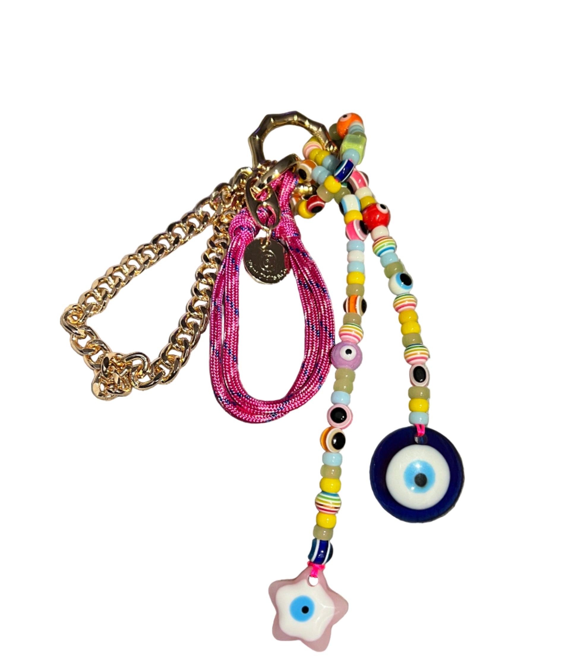 The Fuschia Fortune Bag Charm is a unique accessory designed to enhance your bag. This charm is specifically crafted to add a touch of color and style to your everyday carry. Has fuschia colored rope, gold chain, beads and bead charms.