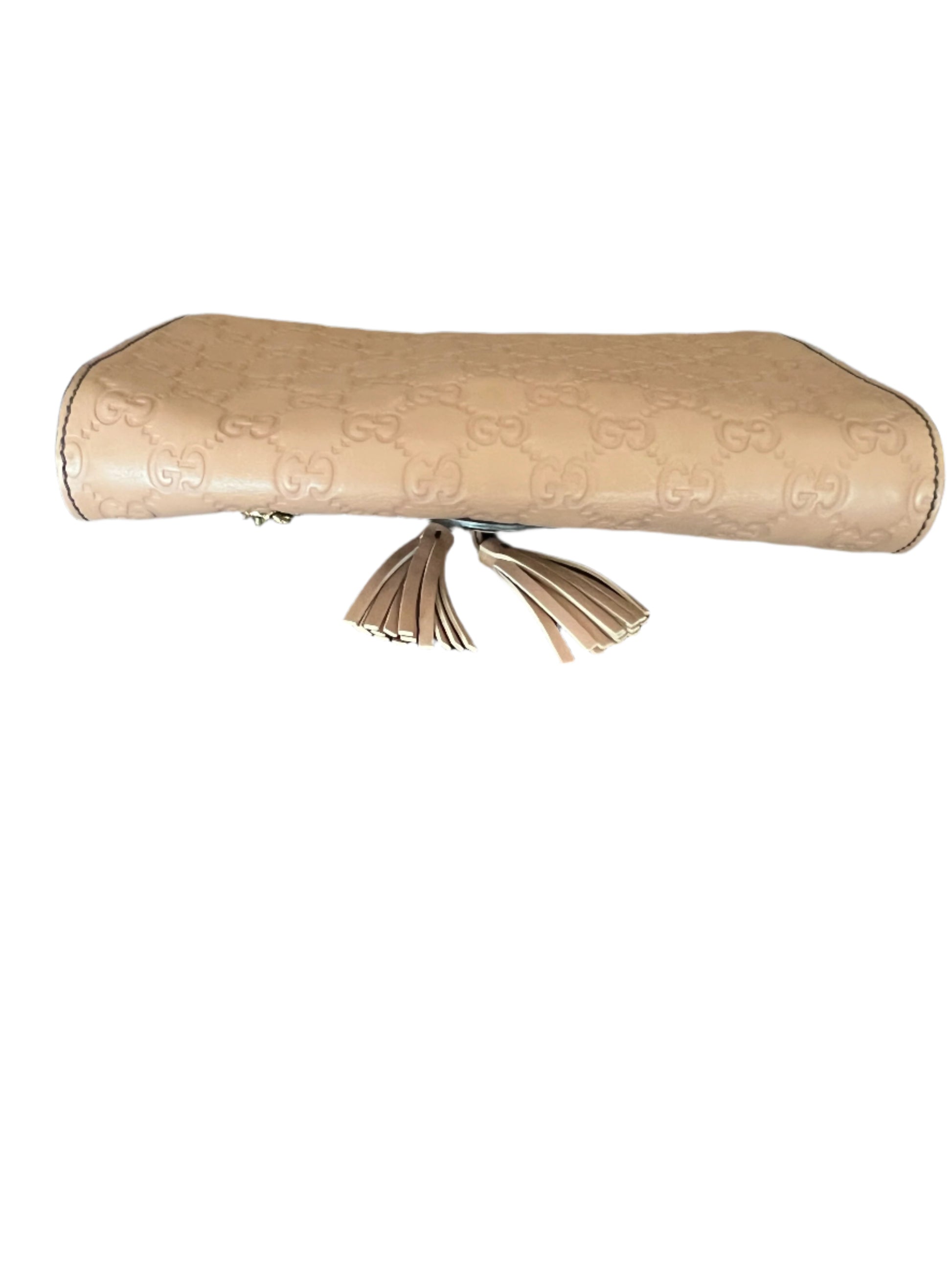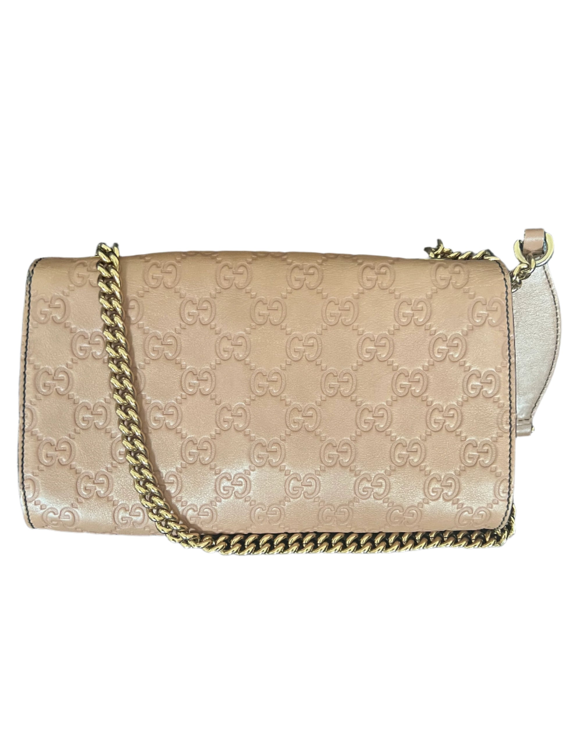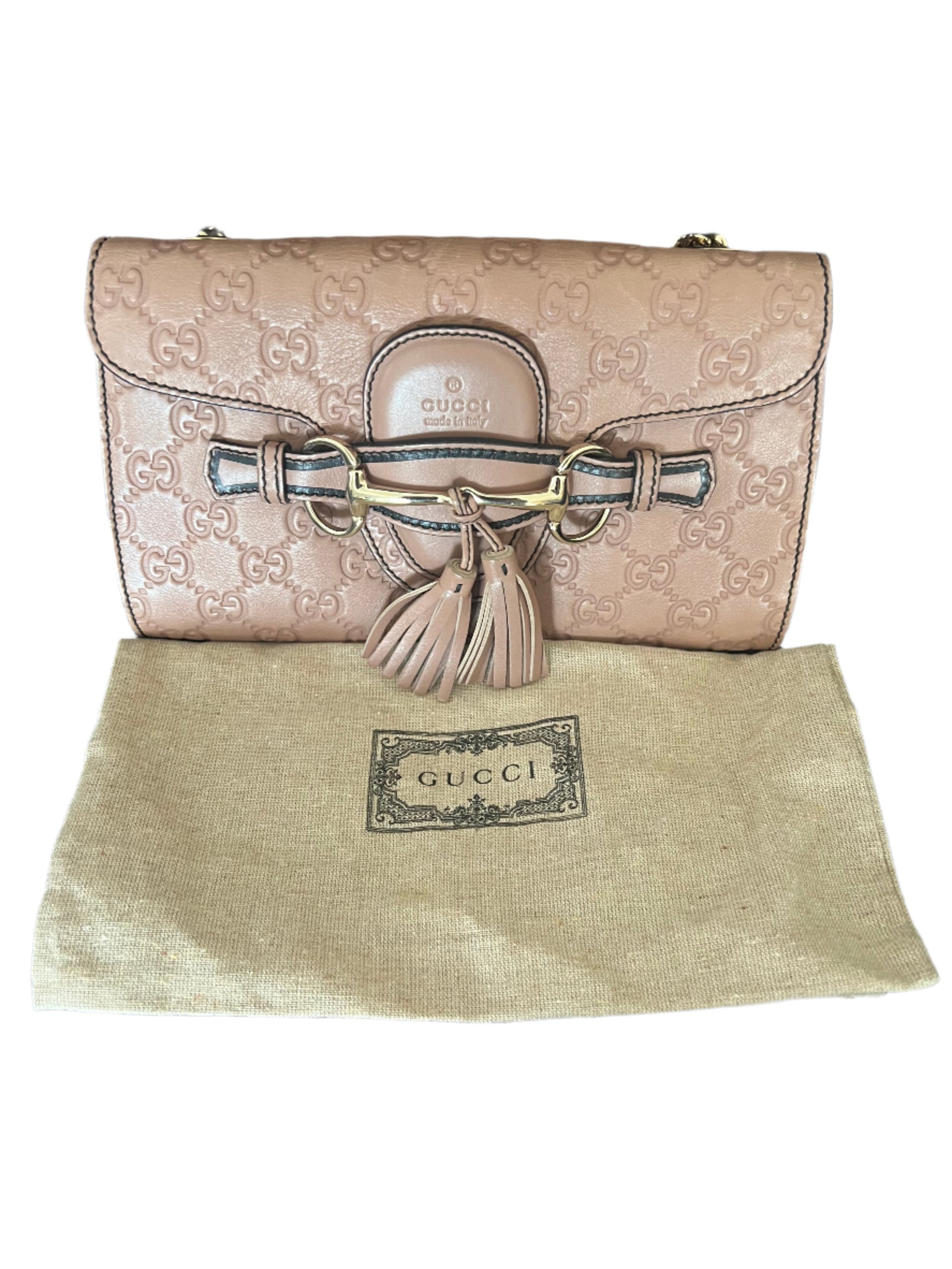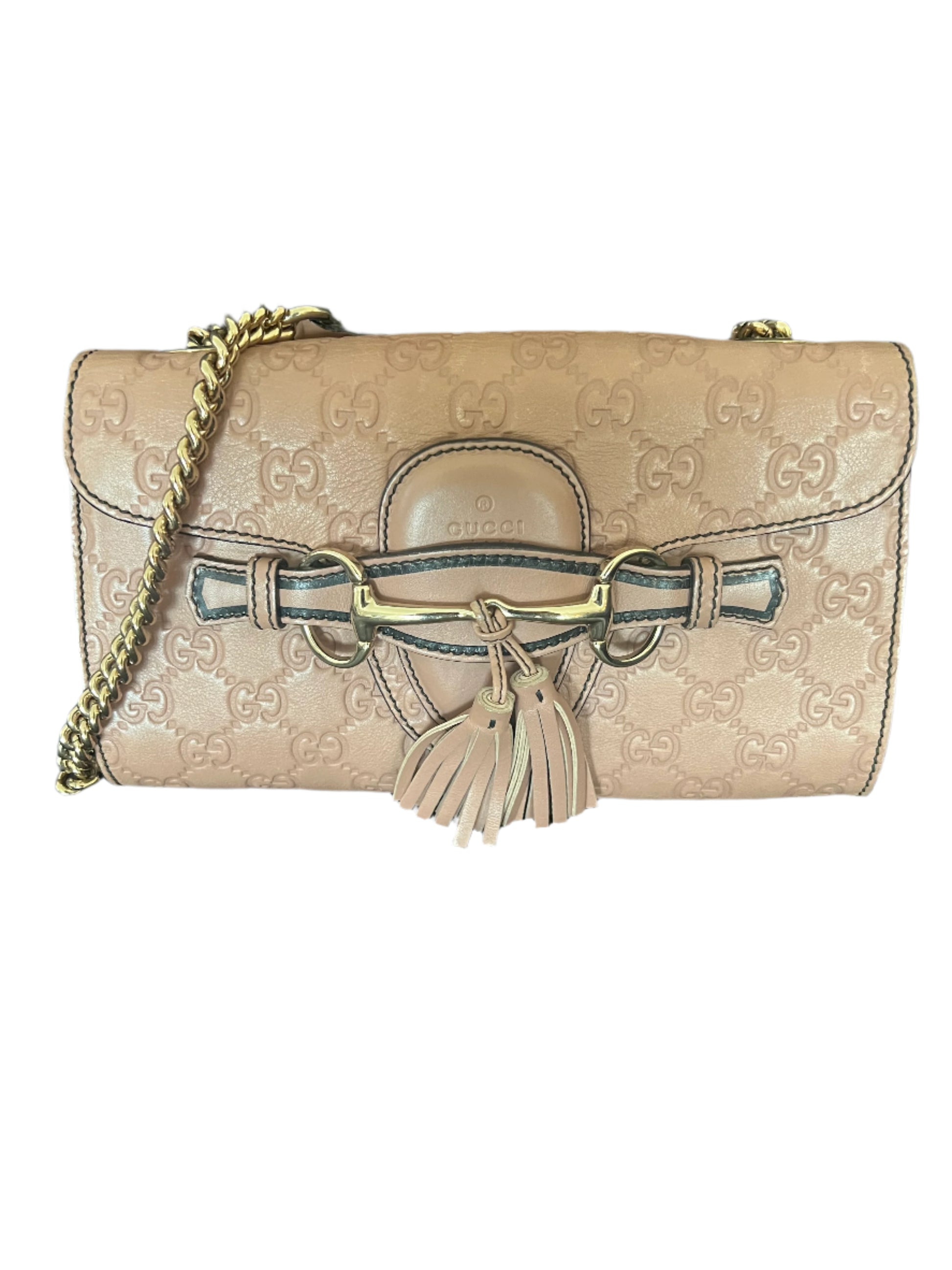 This Gucci Monogram Gucciissima Emily Shoulder Bag is the perfect blend of style and sophistication. Designed in a chic nude color, this bag is a versatile addition to any wardrobe. This chic shoulder bag is crafted of fine Gucci GG monogram embossed leather in beige. The bag features a light gold chain-link shoulder strap and a horse-bit embellishment on the front that secures the crossover flap.