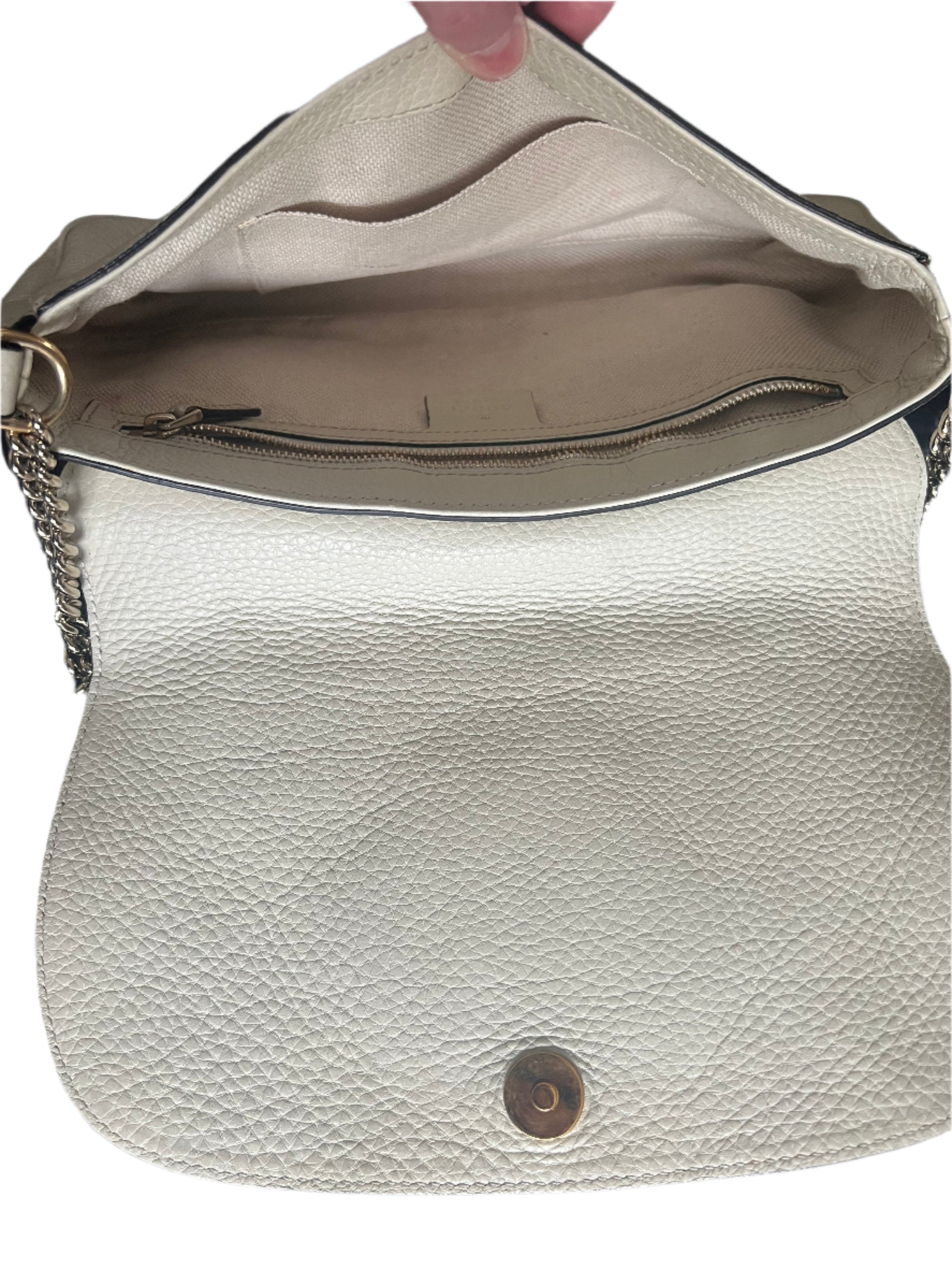 Discover the perfect blend of style and functionality with this Pre-Owned Gucci Pebbled Leather Ivory Soho Flap.