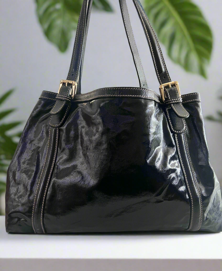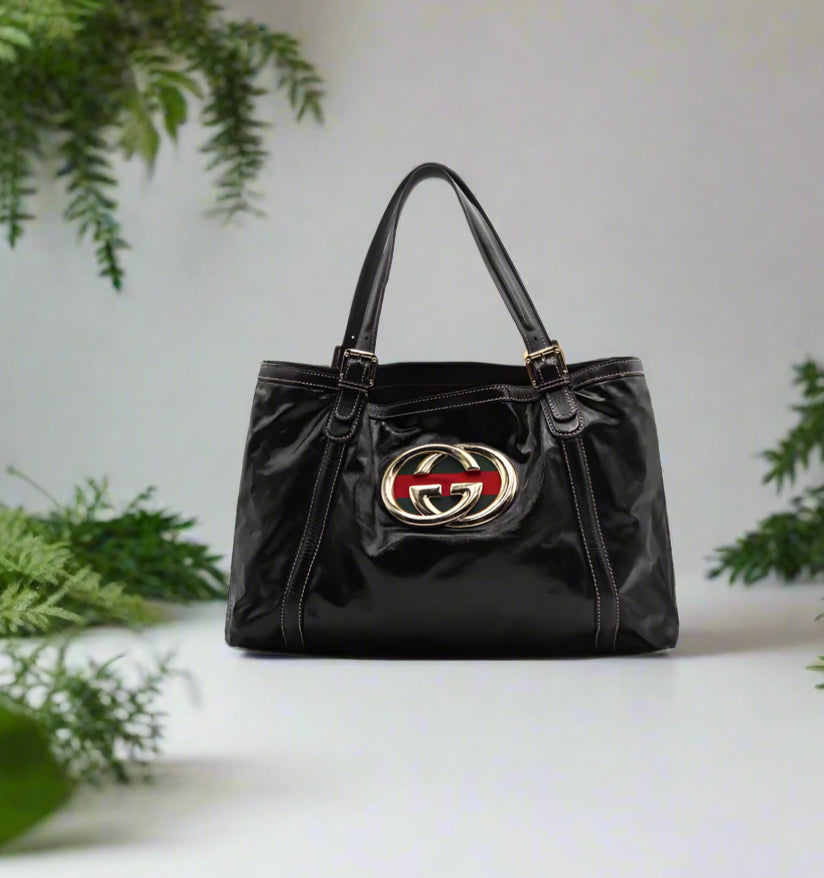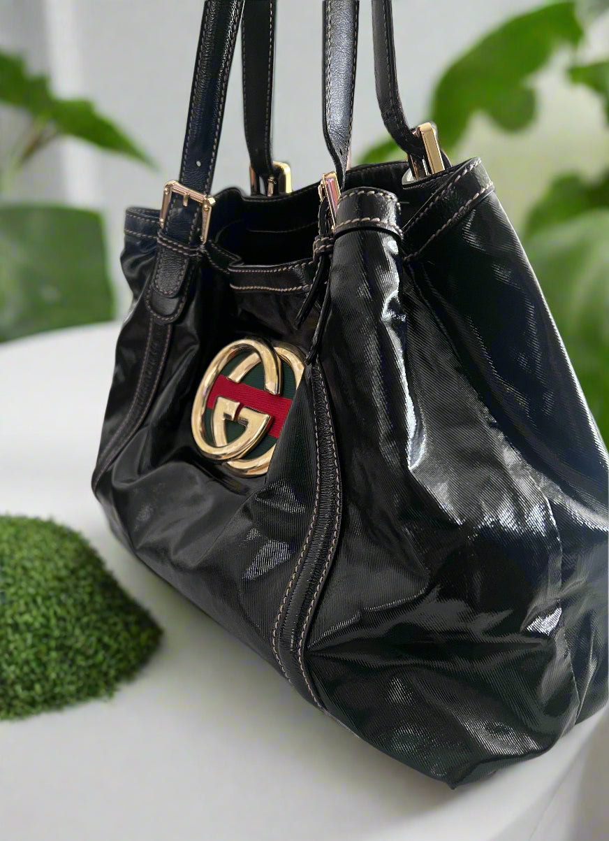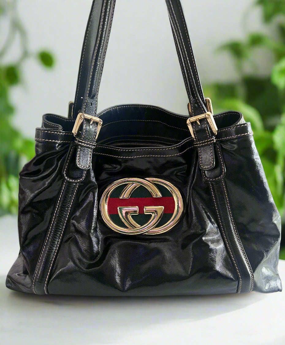 Pre-Owned Gucci Patent Leather Britt Web Tote. Crafted from patent leather, it offers a sleek and modern look with the classic Britt Web design.