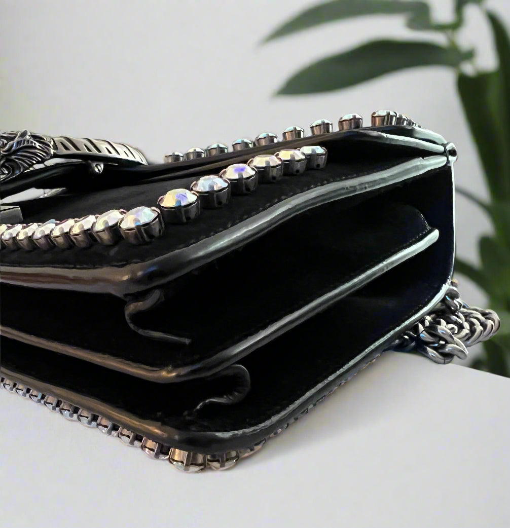 This Dionysus is made of beautiful suede and leather with crystal embellishments. The hardware is antique silver toned. Inside there are two interior sections with a middle zippered section.