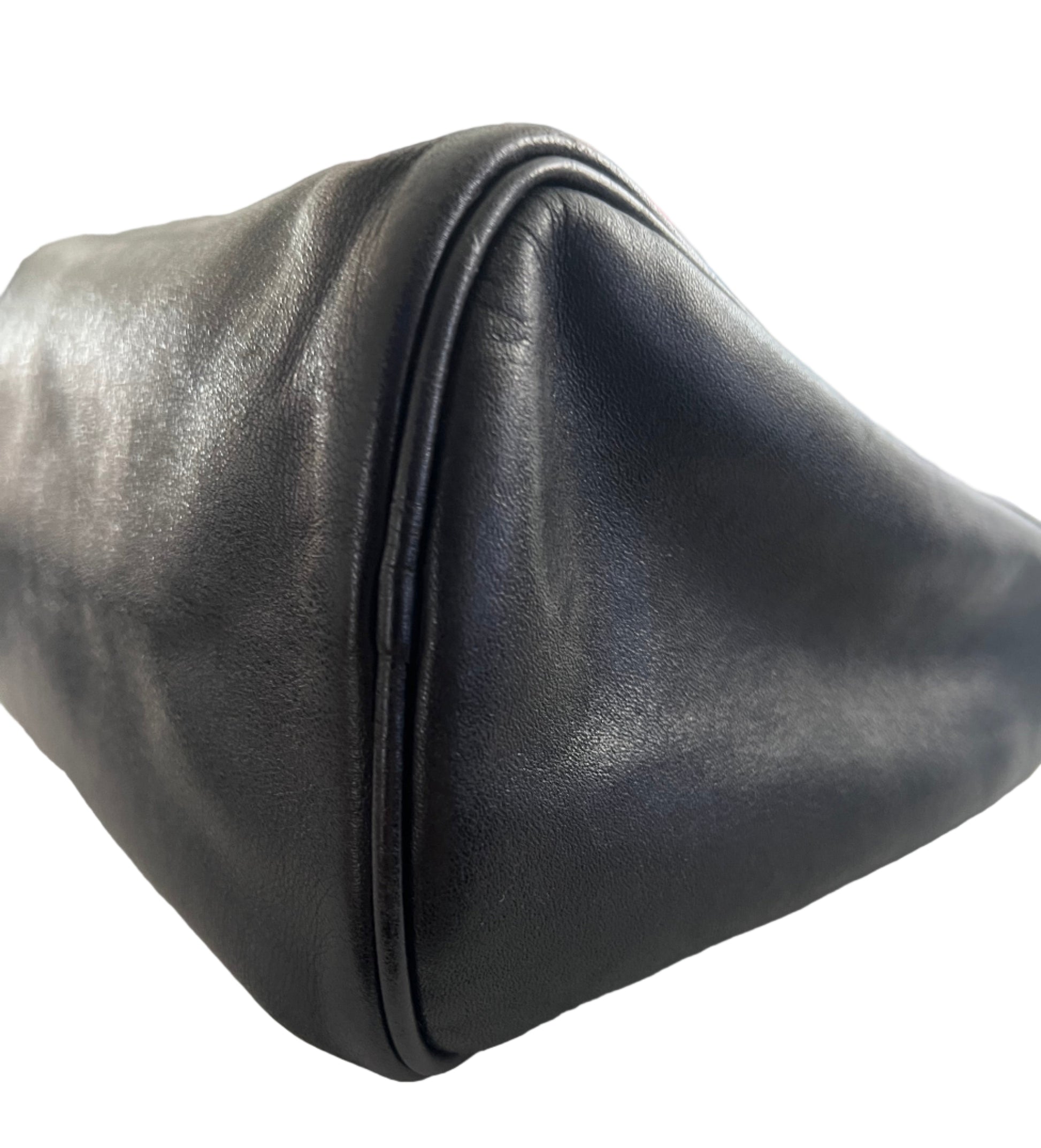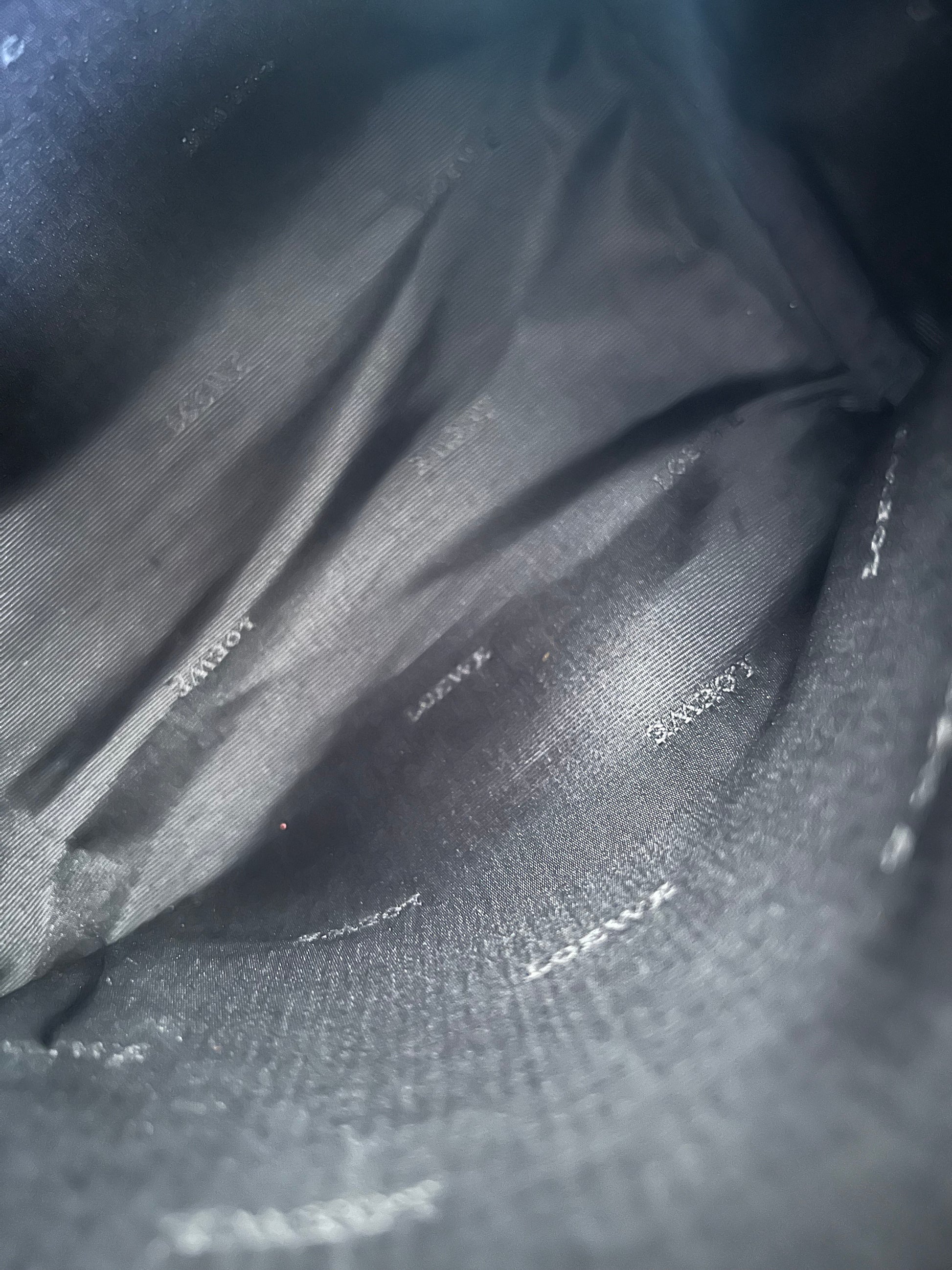 This pouch is in very good condition. The shape has relaxed due to normal use and there is some scuffs to the leather. The gold zipper pull has hardly any silvering. Inside has very spots.