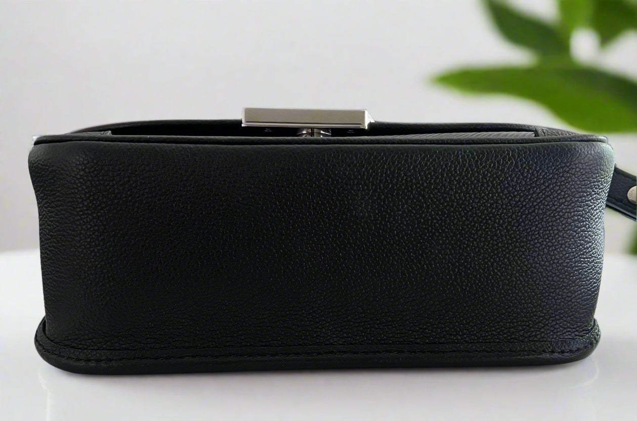 Pre-Owned Louis Vuitton Black Epi Leather Buci. Smooth epi leather while a black resin LV ornament clasp. Also includes a convertible strap and dust bag.