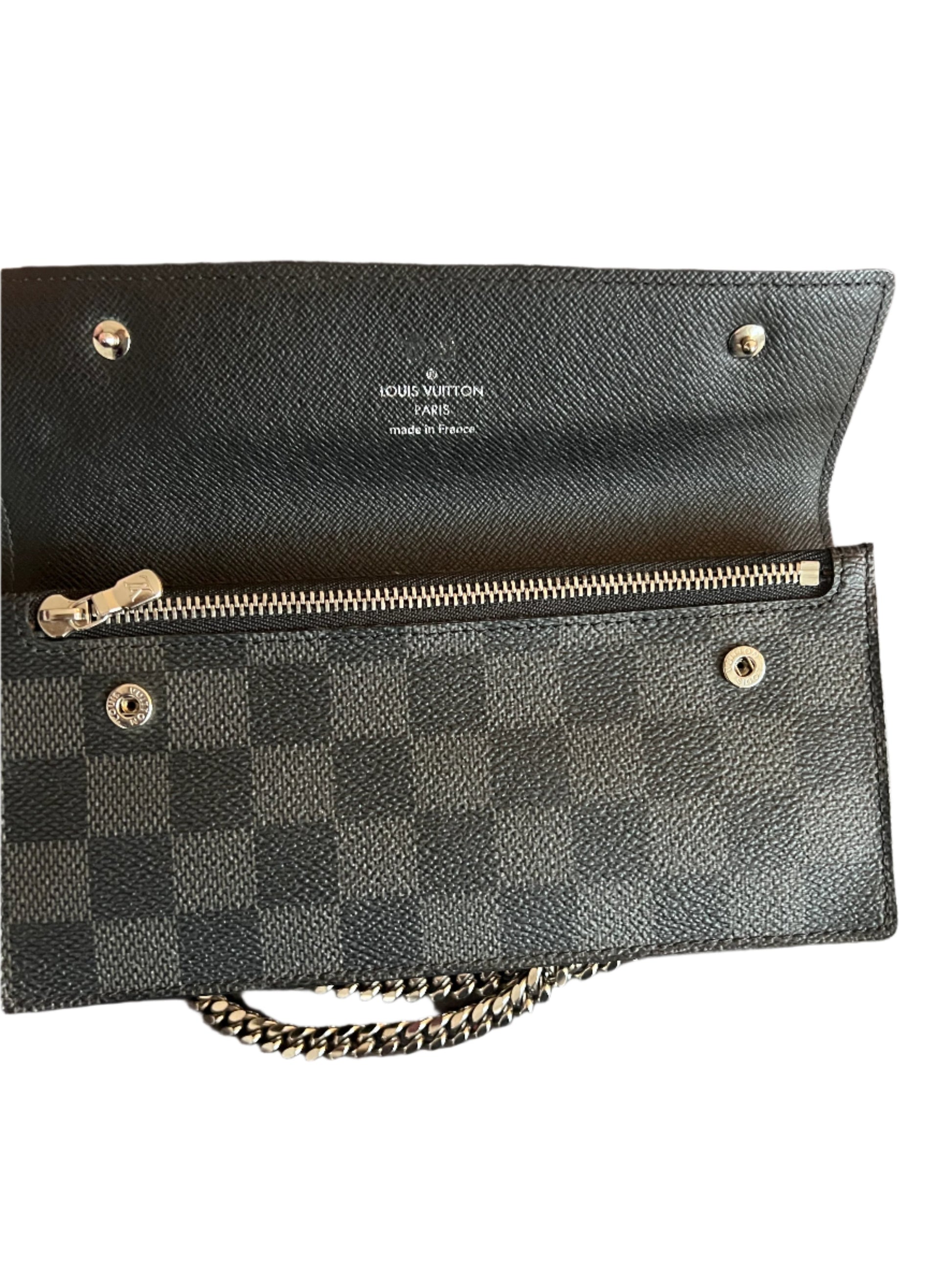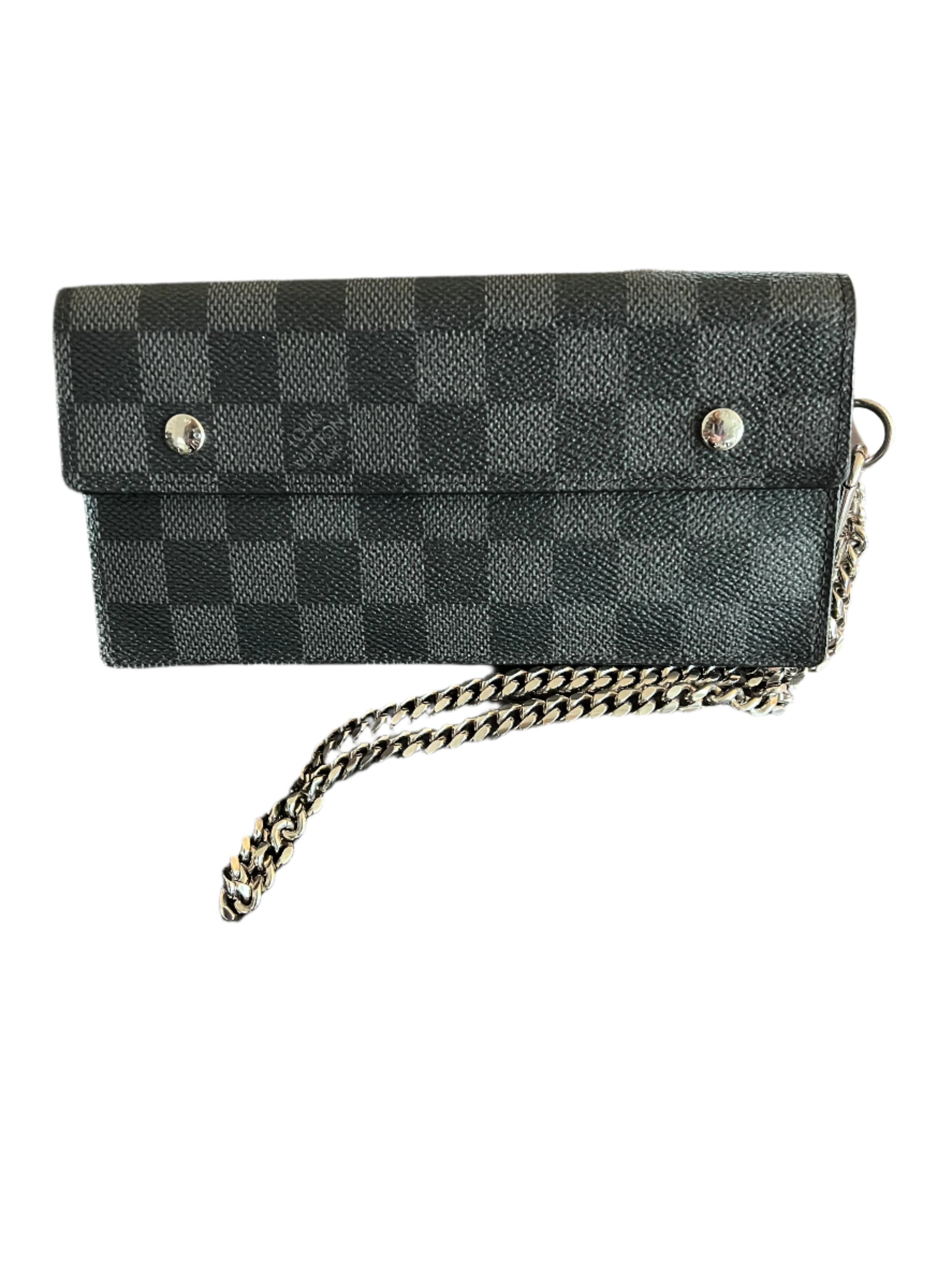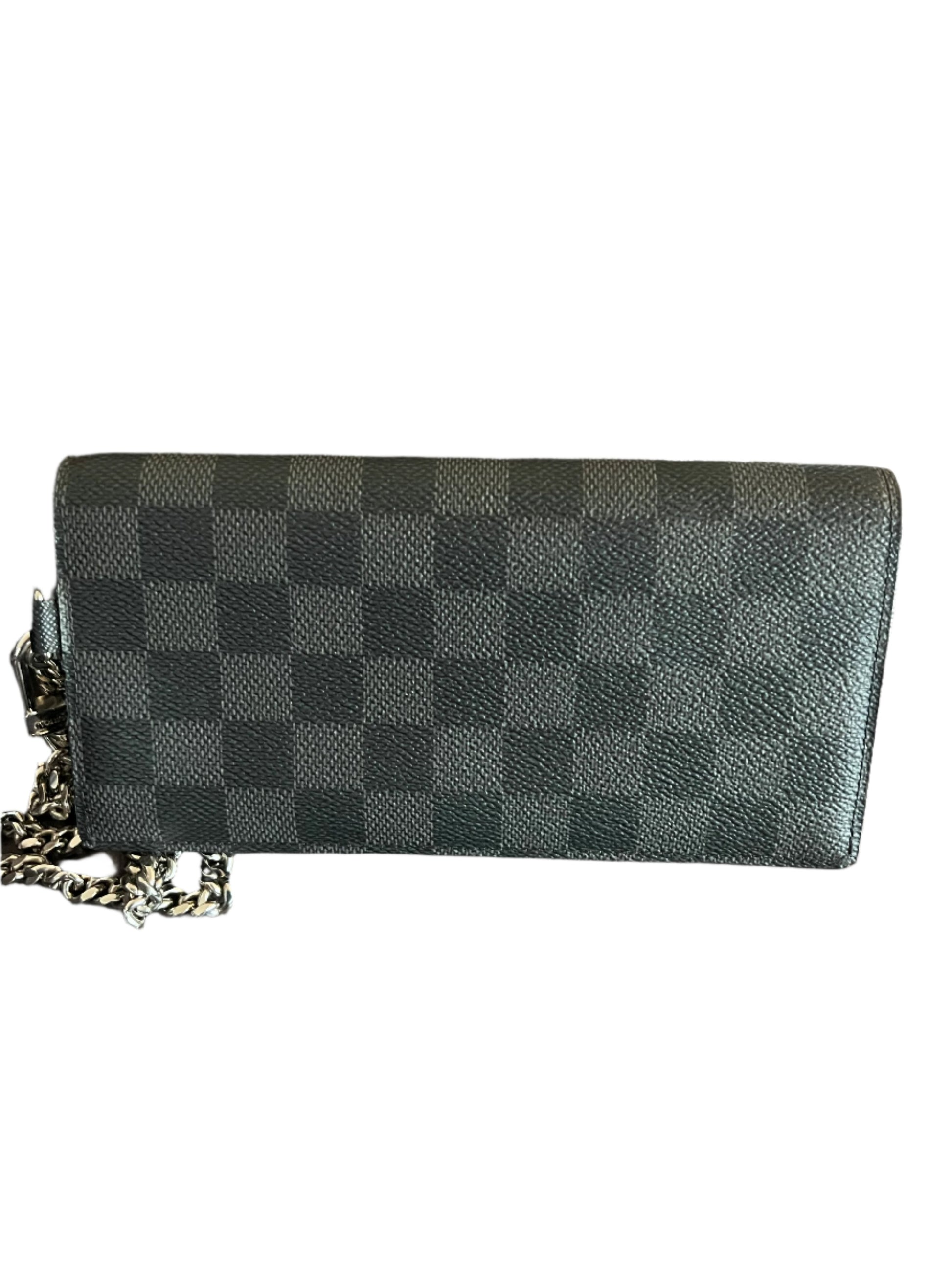 Discover the elegance of the Louis Vuitton Monogram Damier Graphite Accordion, a luxurious small leather goods piece in classic black and gray canvas. It has a silver chain with key clasp, double snap closures, three interior pockets (one with a zip), and six card slots.