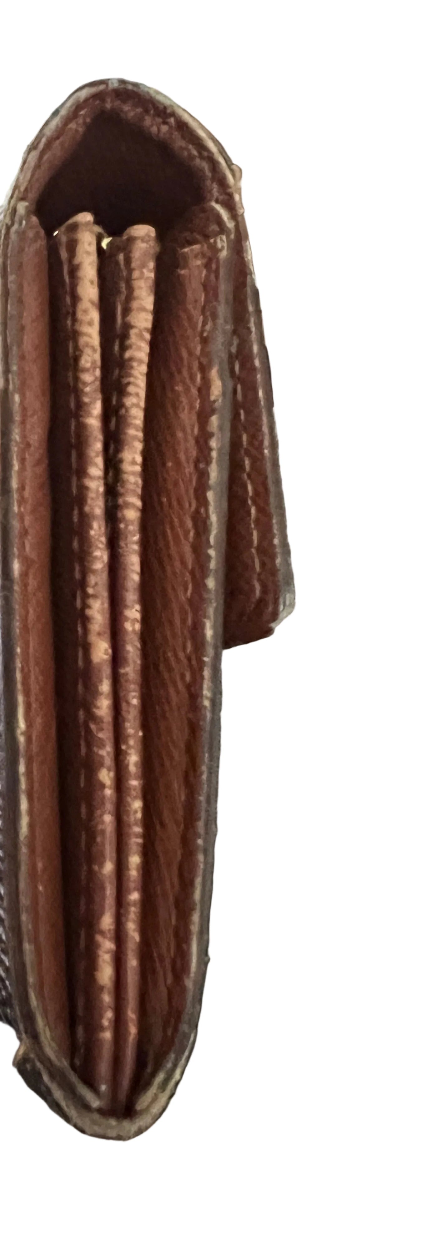 This wallet is in very good condition. There is the feeling of use, normal wrinkling in canvas, some corner wear to the glazing and darkening to the hardware. All sales final