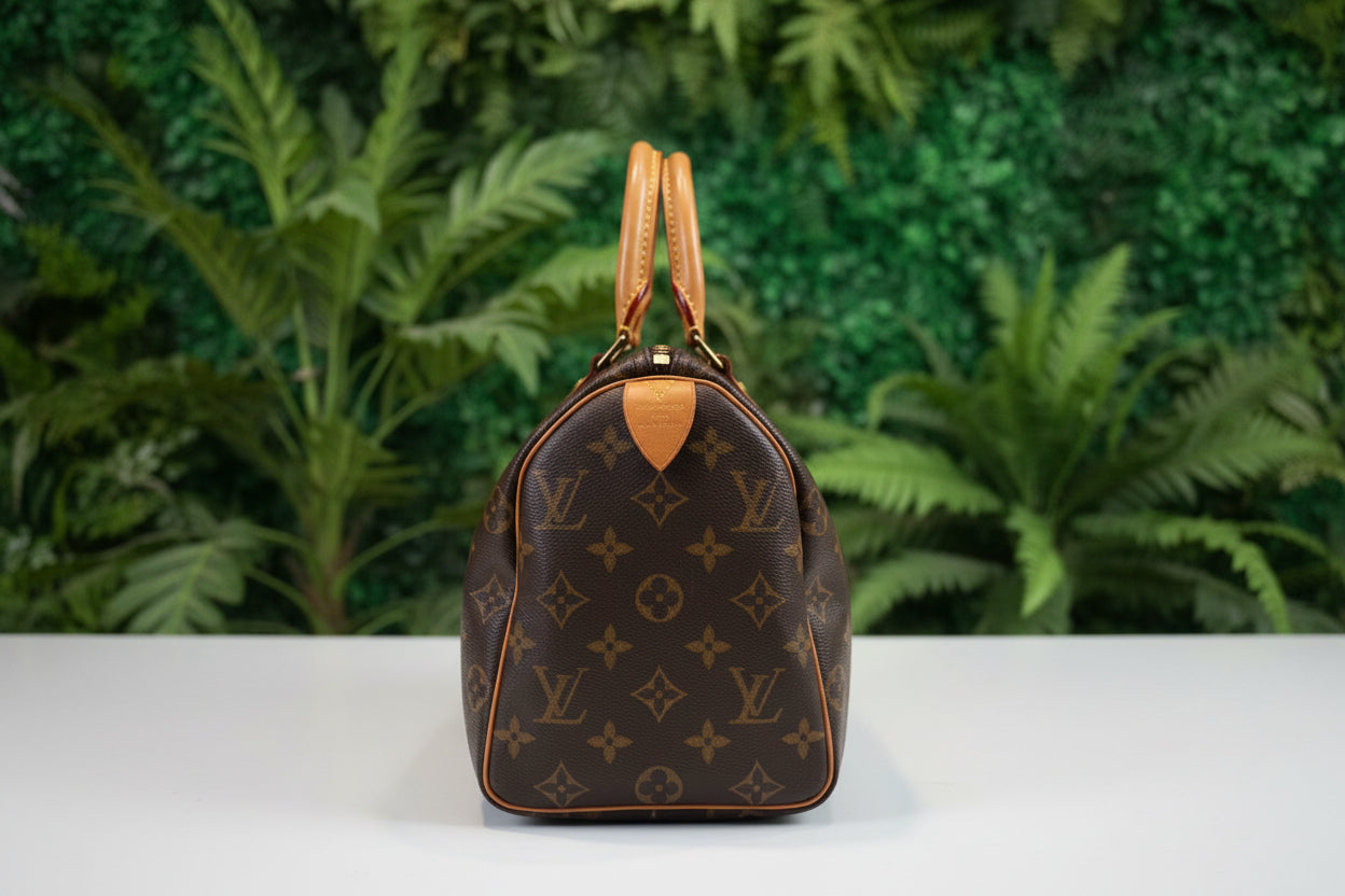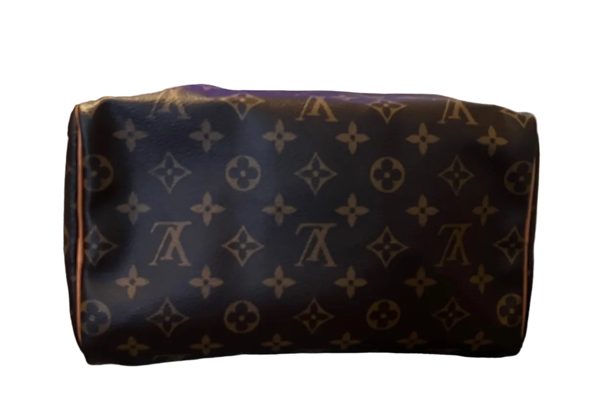 This bag is in excellent condition. The patina on the leather is even with very few spots. The canvas looks beautiful. There is some relaxation in shape which is normal with speedys. Corners have very minor signs of wear. Interior is clean.