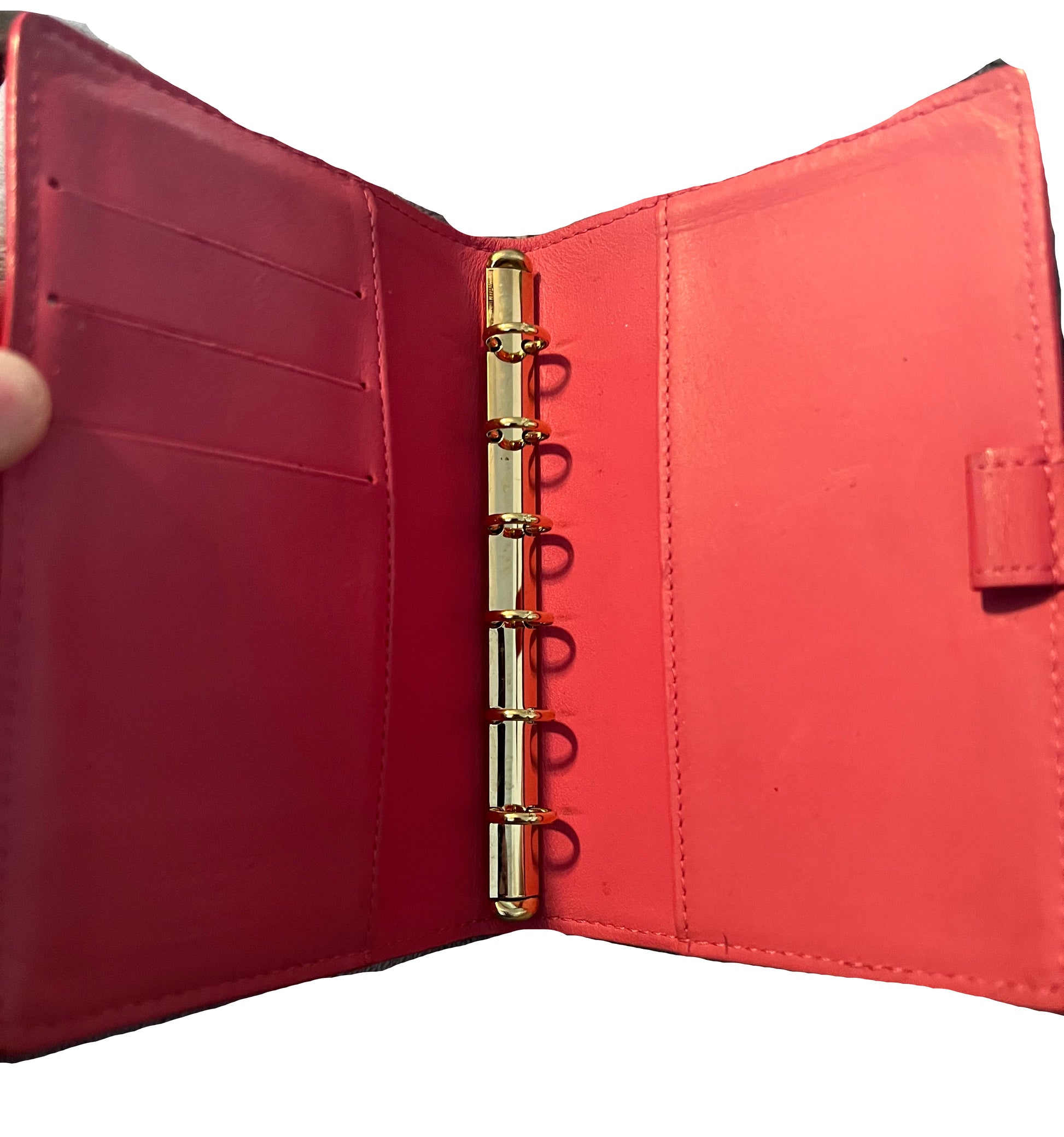 This agenda is in very good condition. There are hardly any signs of wear to the outside and normal signs of use on the inside with a few scuffs and scratches on the leather. All sales final.