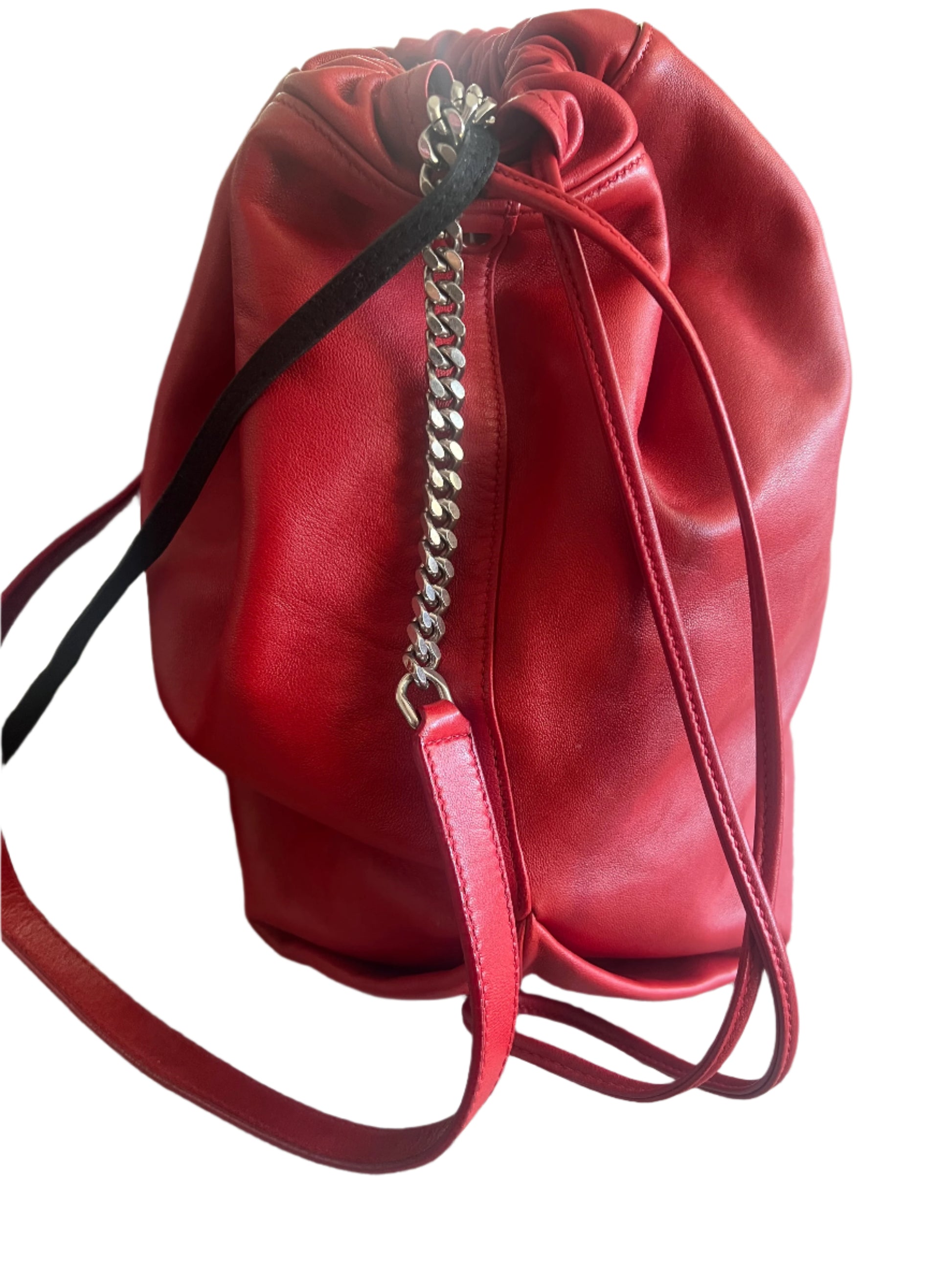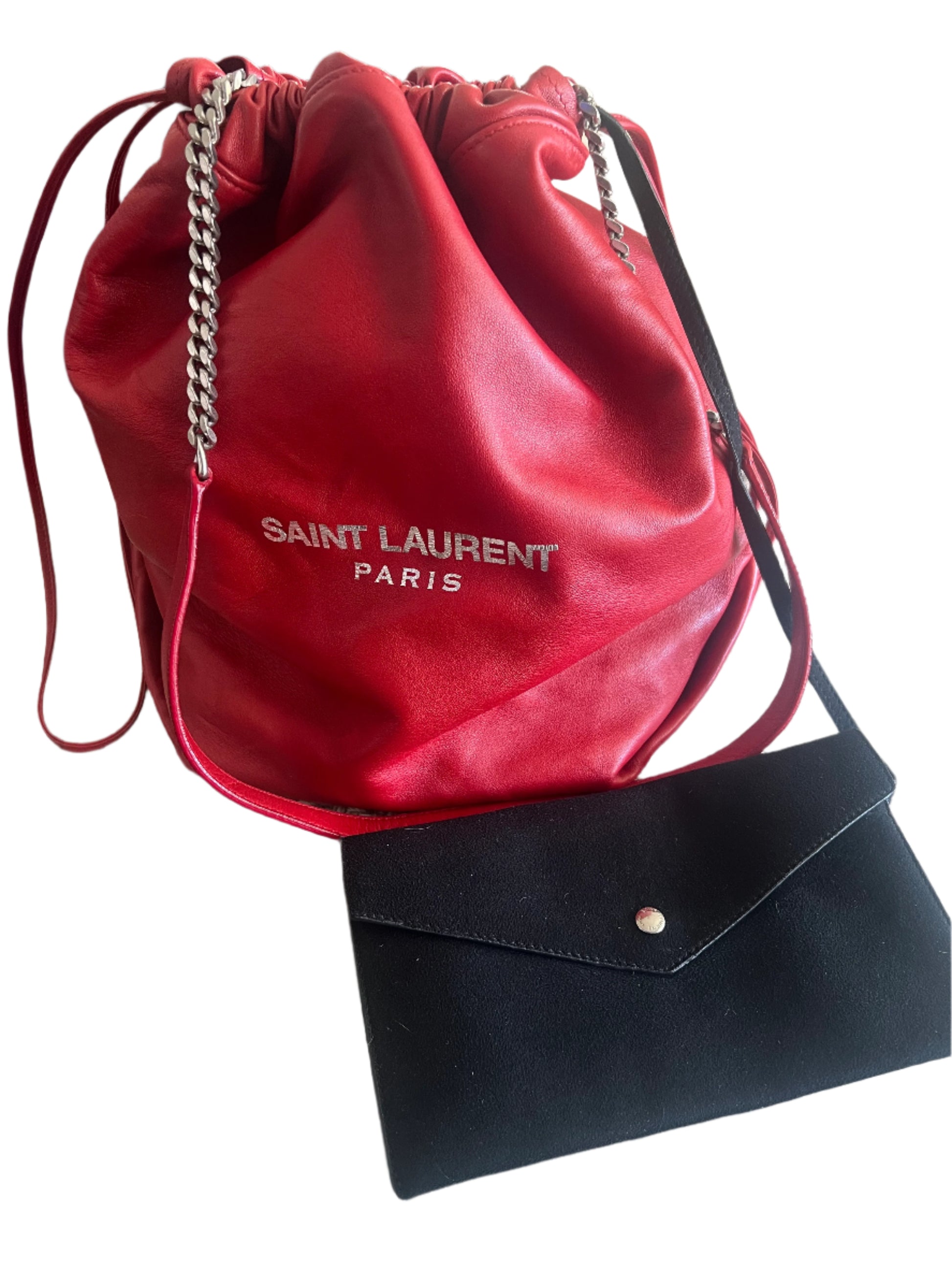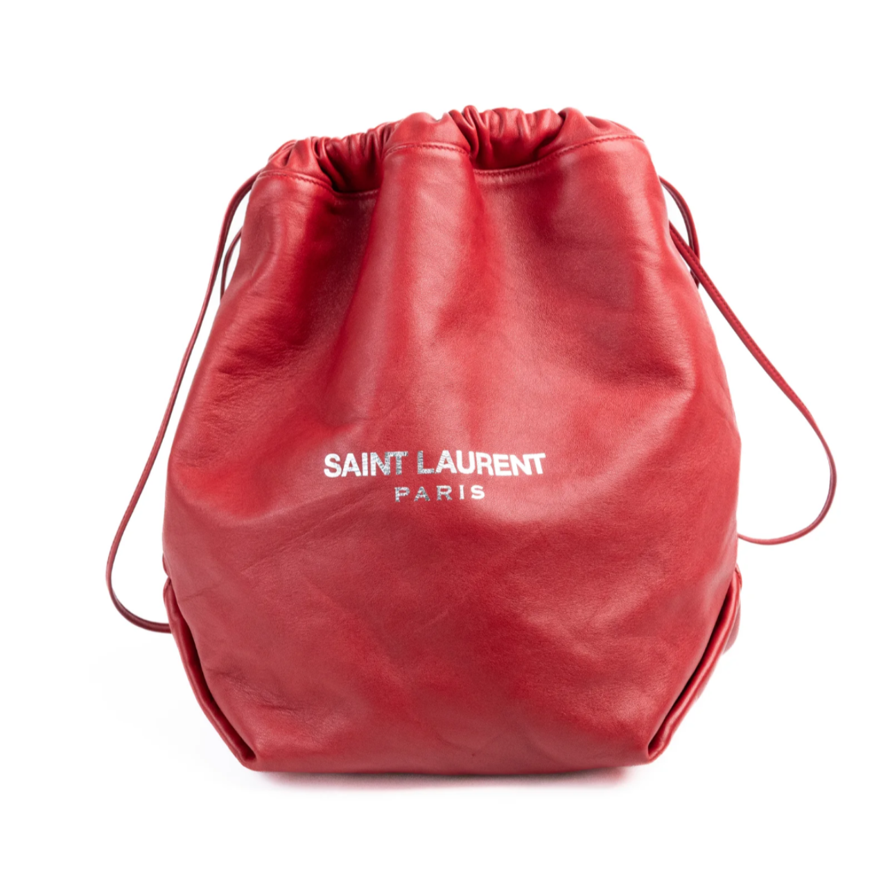 Elevate your accessory game with this stylish and functional Saint Laurent Lambskin Leather Teddy Drawstring Bag in Eros Red.