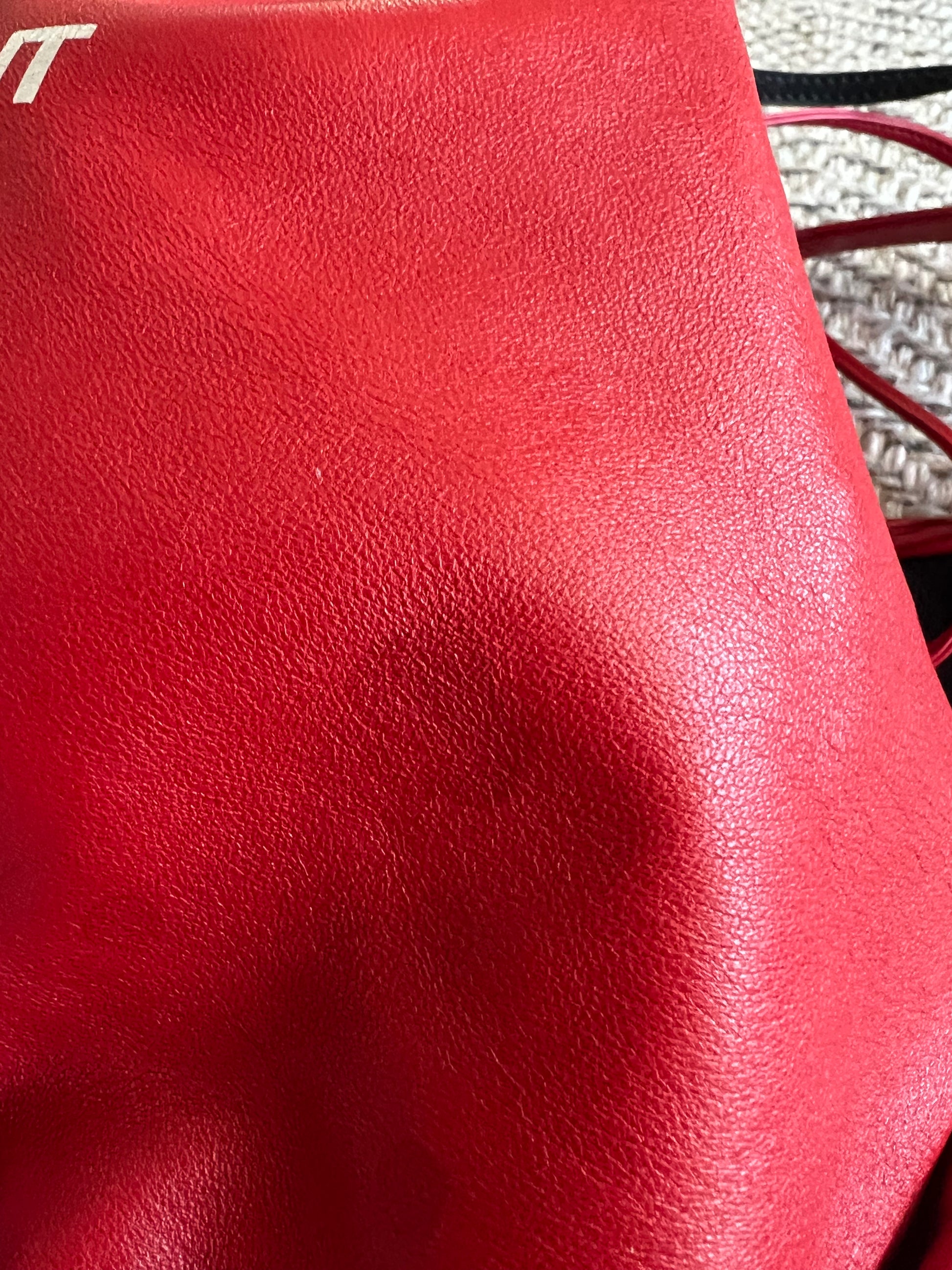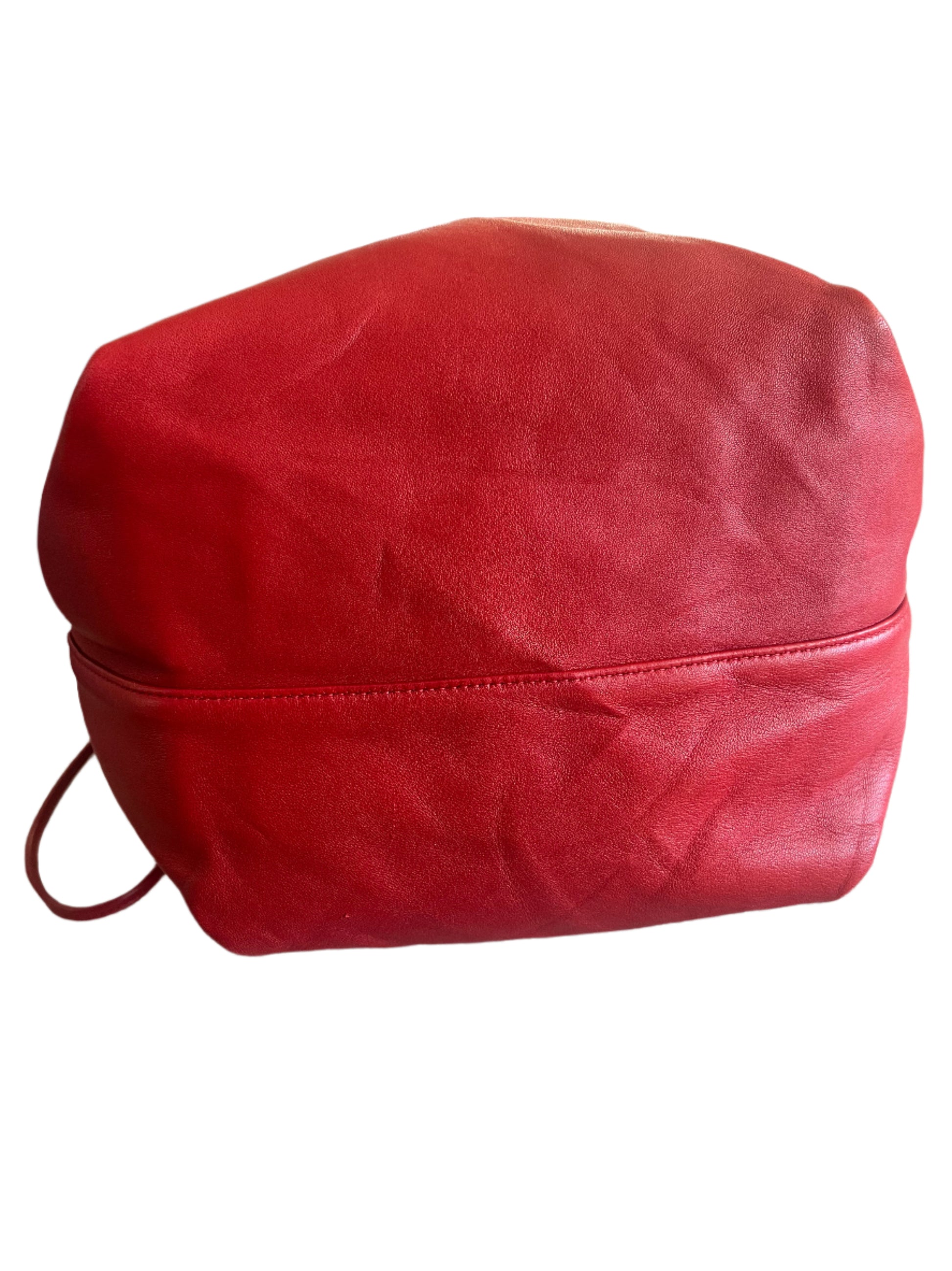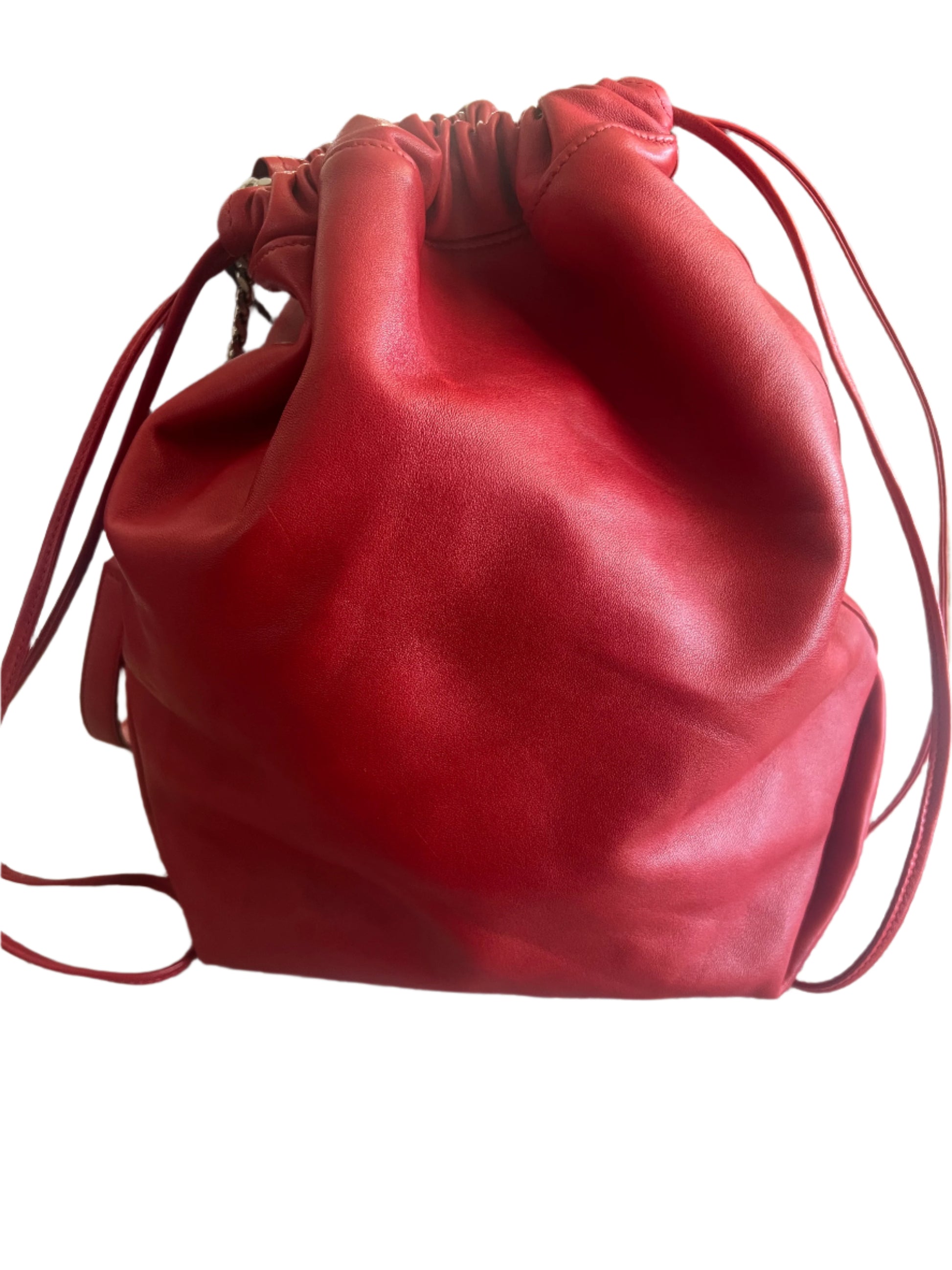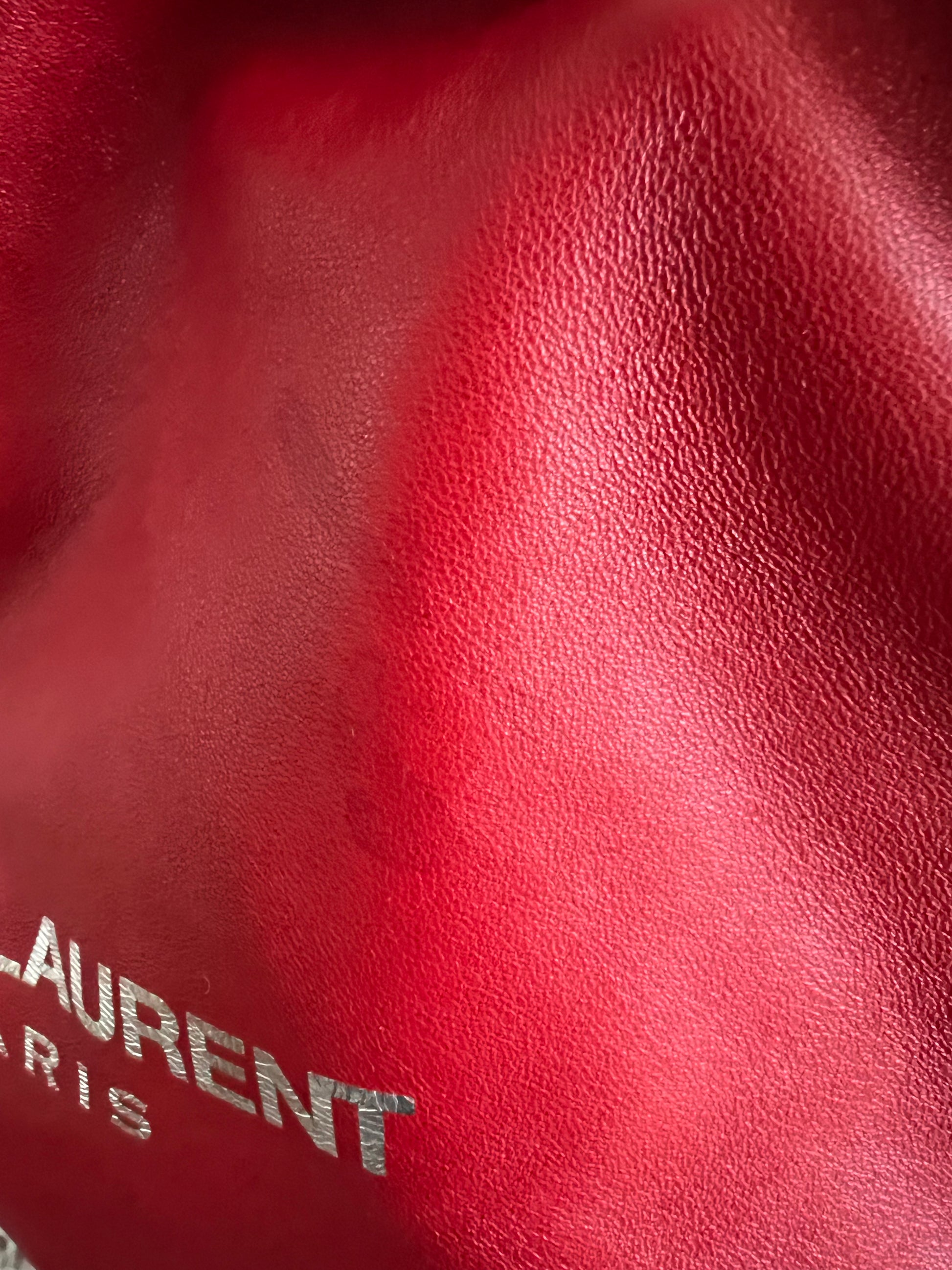 Elevate your accessory game with this stylish and functional Saint Laurent Lambskin Leather Teddy Drawstring Bag in Eros Red.